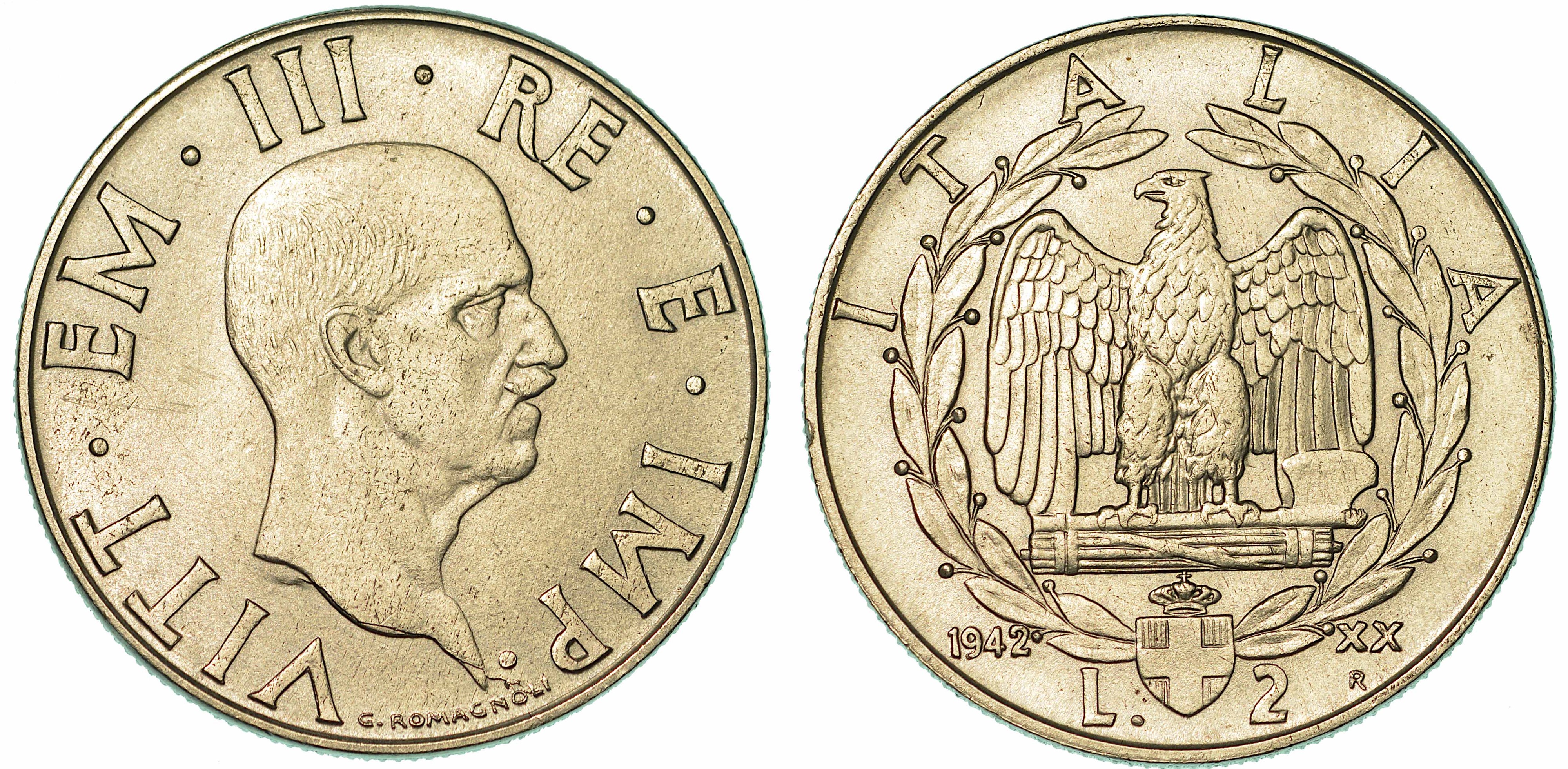 REGNO D'ITALIA. VITTORIO EMANUELE III DI SAVOIA, 1900-1946. 2 Lire 1942/A. XX. Impero