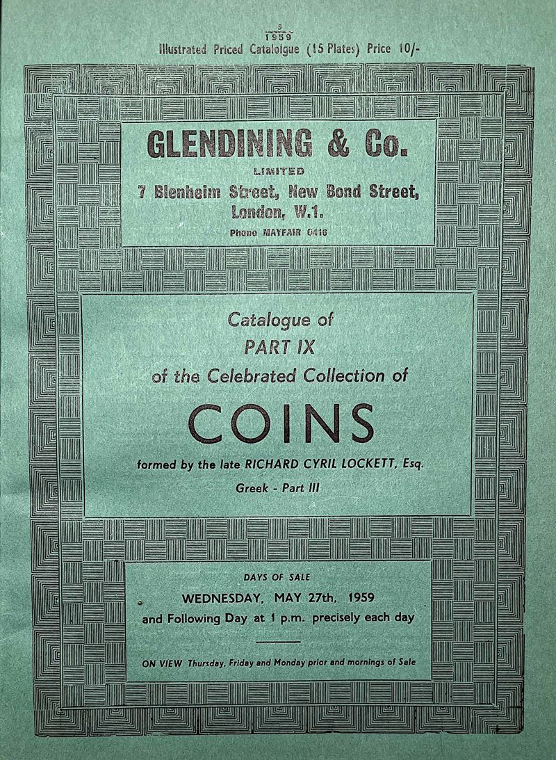 SOTHEBY. 15 cataloghi d'aste datate al 1963, di argomento prettamente numismatico ed archeologico, rilegati insieme. Circa cm. 20x26. Mezza tela. Condizioni buone - GLENDINING. Collezione R.C. LOCKETT. Londra, 27 maggio 1959. Lotti offerti 2118. tavv. 15. Circa cm. 19x25. Mezza tela. Ex libris Ciferri. Condizioni molto buone.