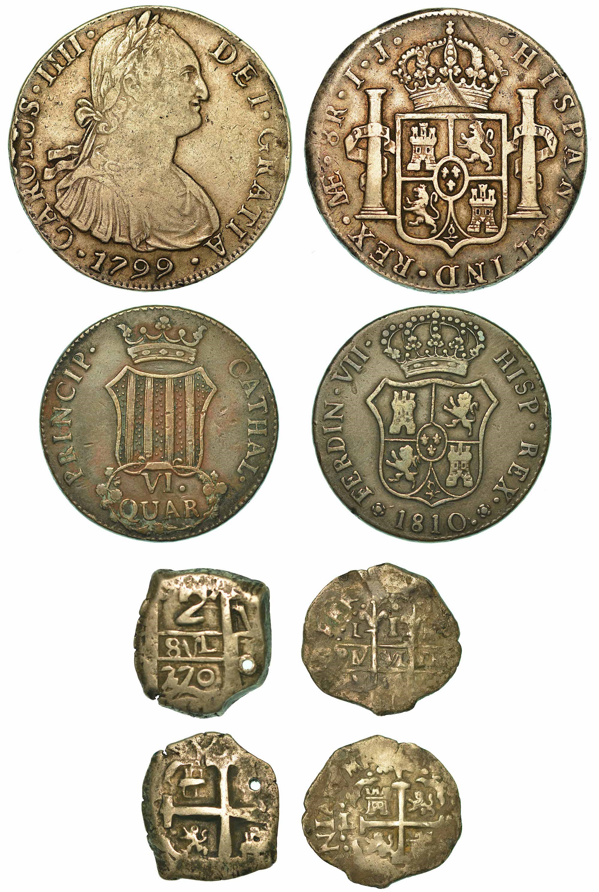 FELIPE V, 1700-1746. 2 Reales. g. 6,70. Arg. q.BB (foro) - Real. g. 2,91. Arg. MB/BB - CARLOS IV, 1788-1808. 8 Reales 1799 (Lima). g. 26,40. Arg. MB/BB - FERNANDO VII, 1808-1833. 6 Quartos 1810 (Barcellona). 14,36. Rame. q.BB