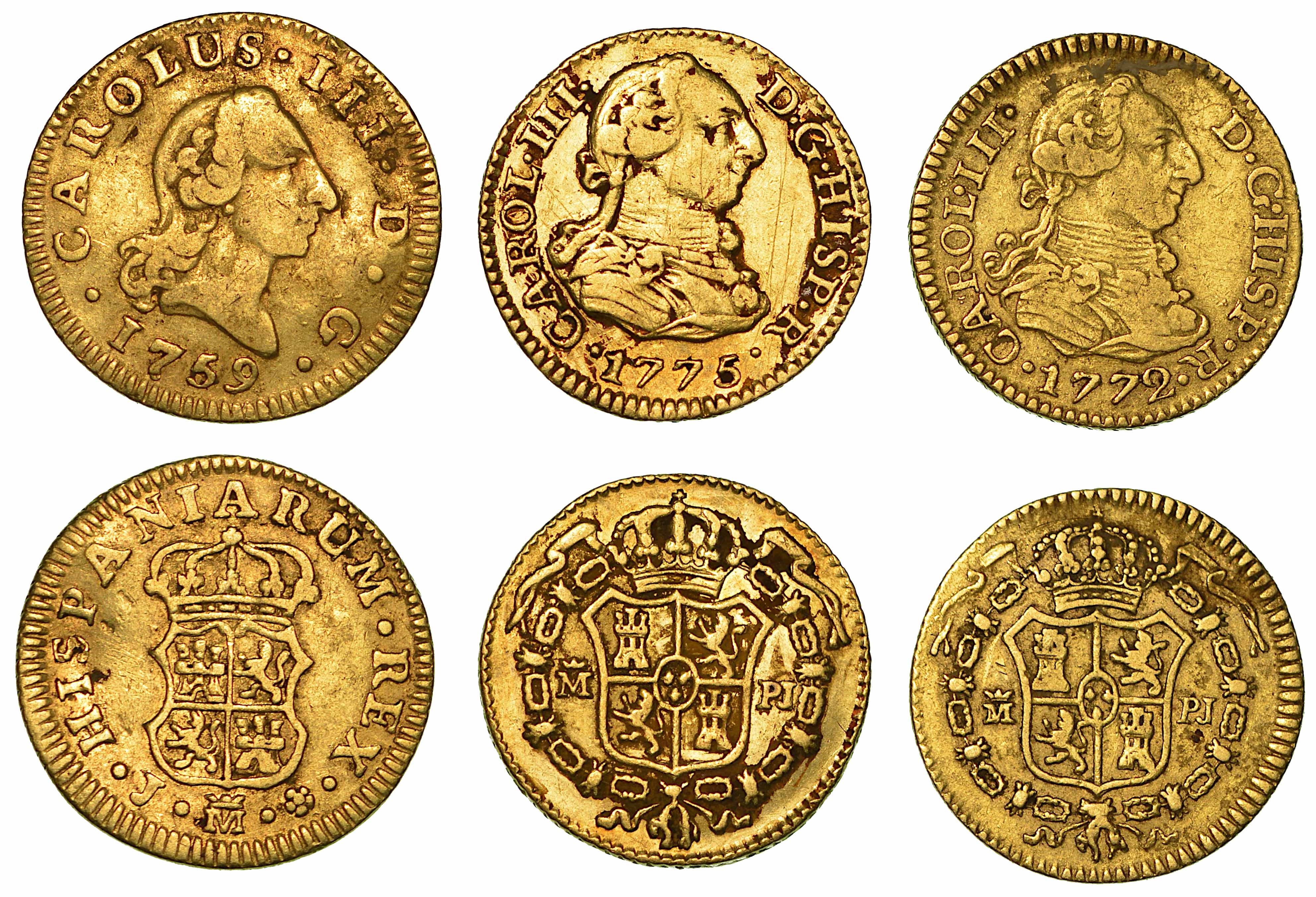 CARLOS III, 1759-1788. 1/2 Escudo 1759 (Madrid). Friedb. 278. g. 1,75. Diam. mm. 15,17. MB - 1/2 Escudo 1772 (Madrid). Friedb. 290. g. 1,75. Diam. mm. 14,70. Oro. MB - 1/2 Escudo 1775 (Madrid). Friedb. 290. g. 1,77. Diam. mm. 14,72. Oro. BB