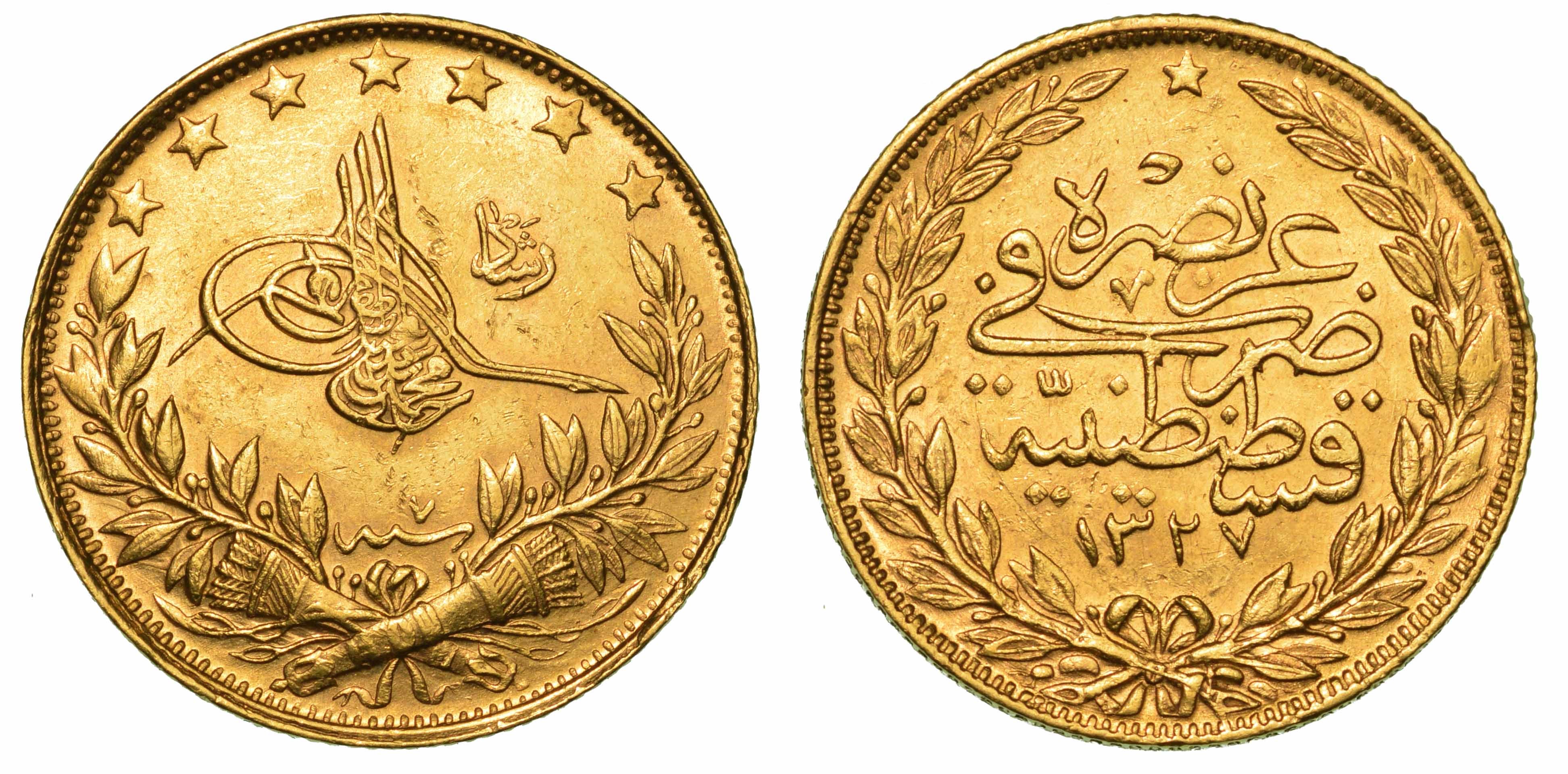 Al centro tughra; sopra sette stelle. Sotto, due rami di alloro. R/ Legenda araba al centro di due rami di alloro. Friedb. 52. g. 7,21. Diam. mm. 22,26. Oro. SPL