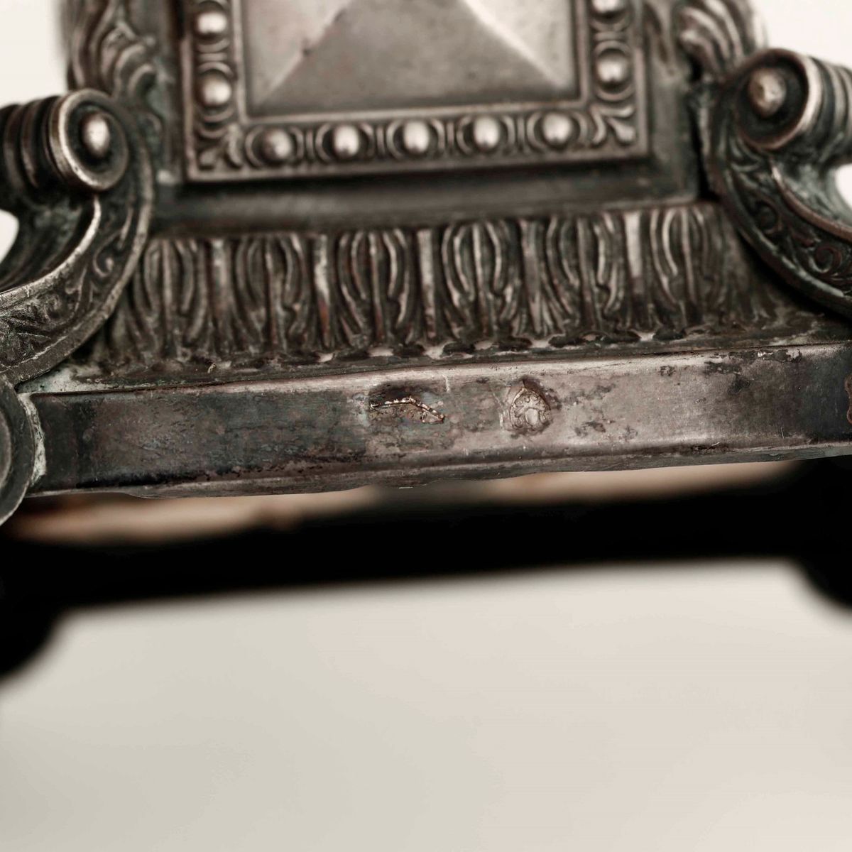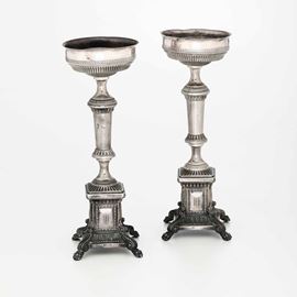 Coppia di candelieri in argento fuso, sbalzato e cesellato. Roma bollo camerale in uso dal 1815 al 1870. Argentiere non identificato (marchio consunto)