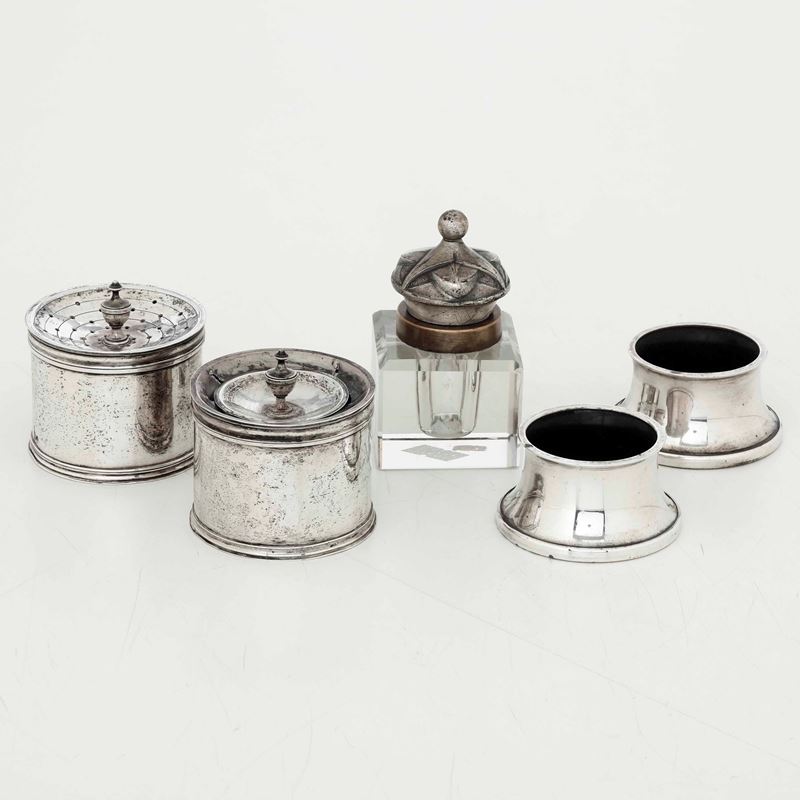 Due coppie di bussolotti da scrittura in argento e un calamaio in metallo e vetro. Differenti manifatture ed epoche dal XVIII al XX secolo