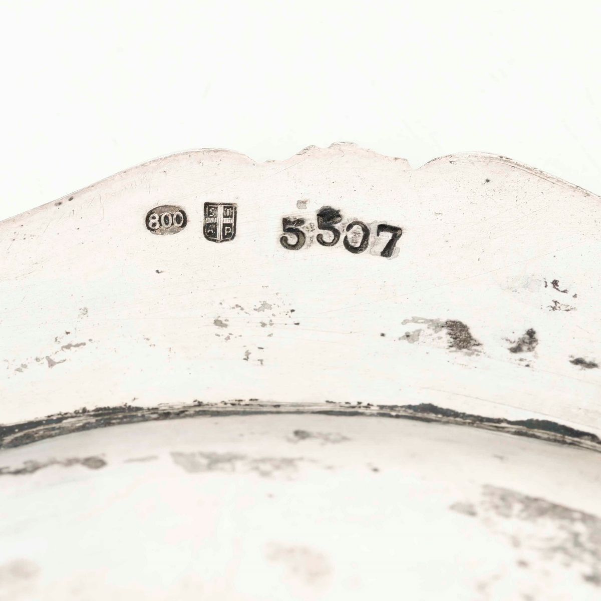 Grande piatto in stile barocchetto. Argento fuso e sagomato. Argenteria italiana del XX secolo. Argentiere SIAP, Alessandria