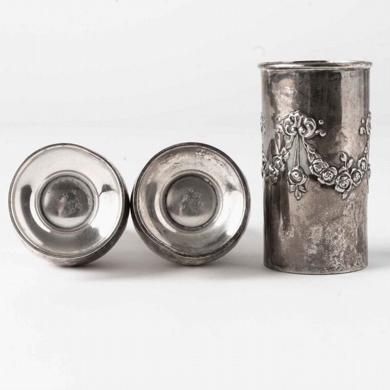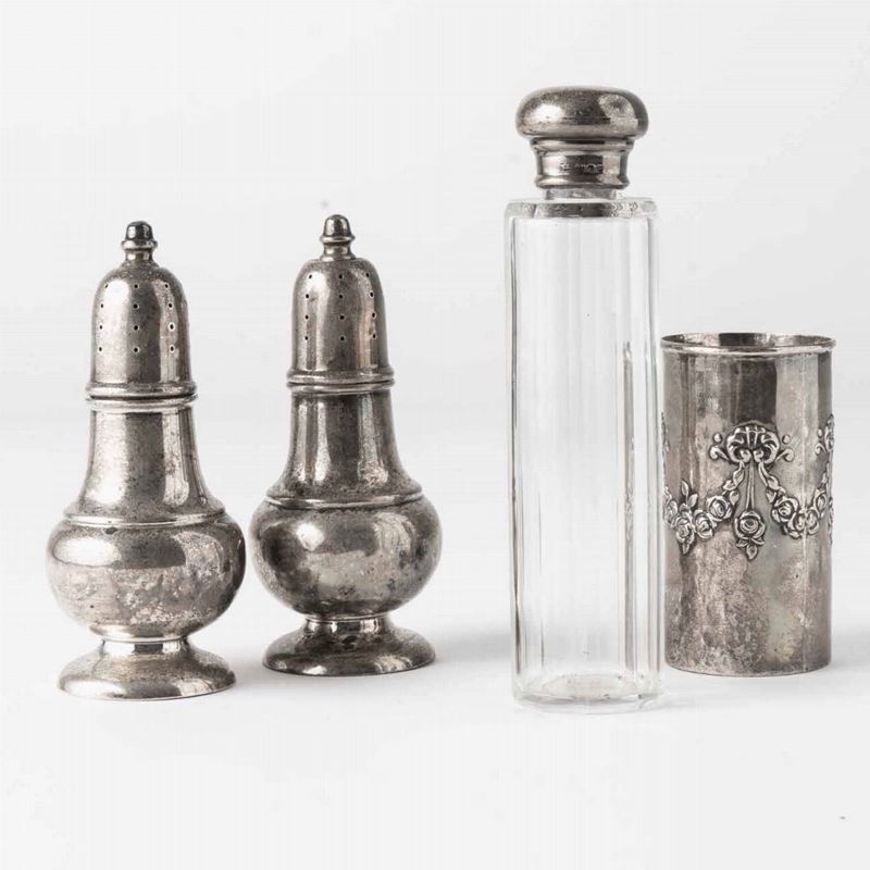 Lotto di un sale e pepe in argento 925, un vasetto in argento inglese e una boccetta con tappo in argento. XX secolo