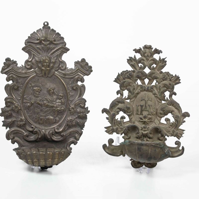 Coppia di candelieri in metallo sbalzato argentato, cartagloria con specchio, due acquasantiere in metallo argentato XVIII-XIX [..]