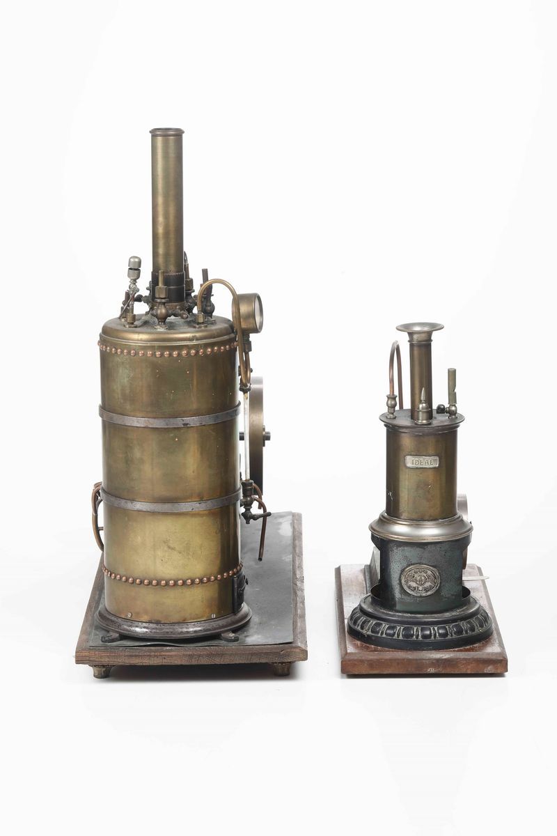 Macchina a vapore giocattolo con caldaia verticale, manometro a fischio, 1910 circa e altra macchina a vapore firmata E. P. (Ernest Plank)