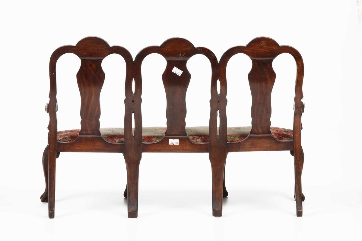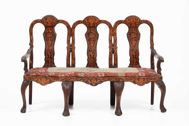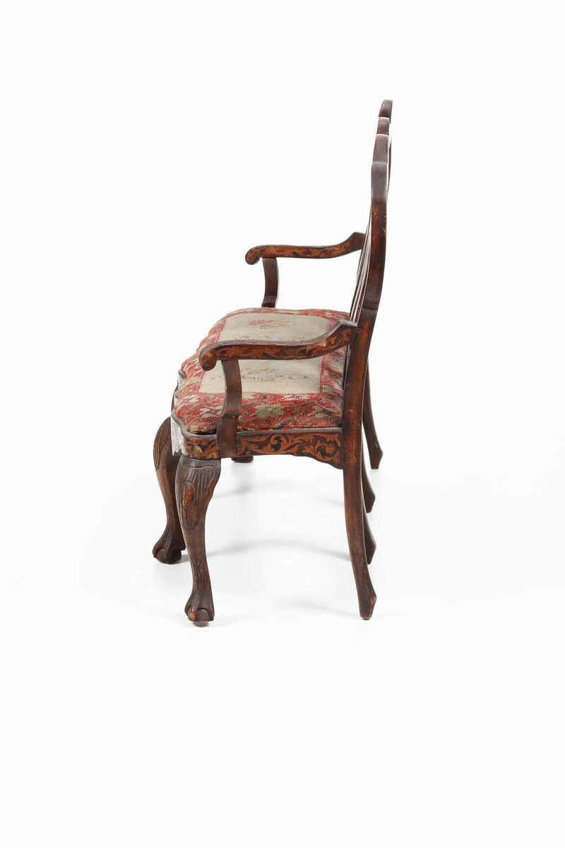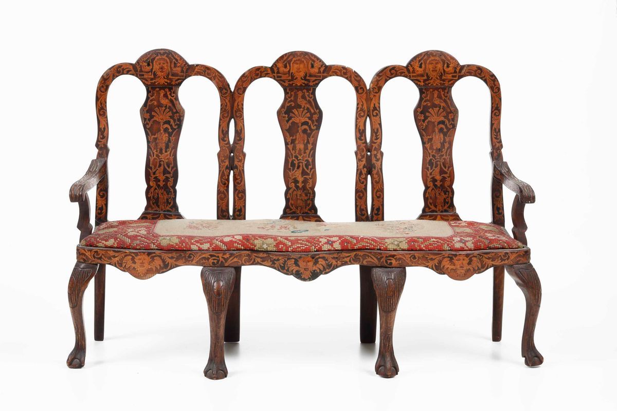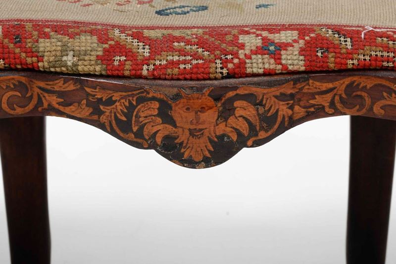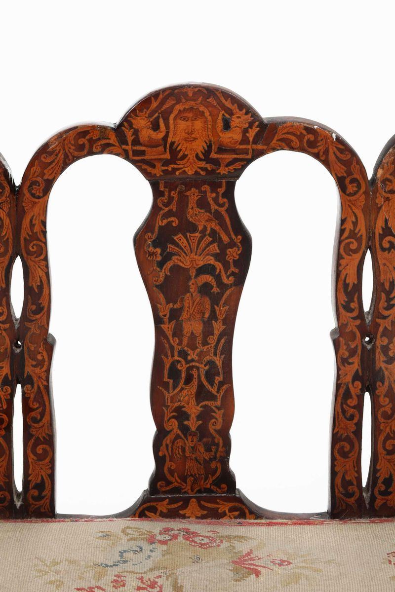 spalliera intarsiata al modo olandese; la seduta è coperta con tessuto ricamato a piccolo punto