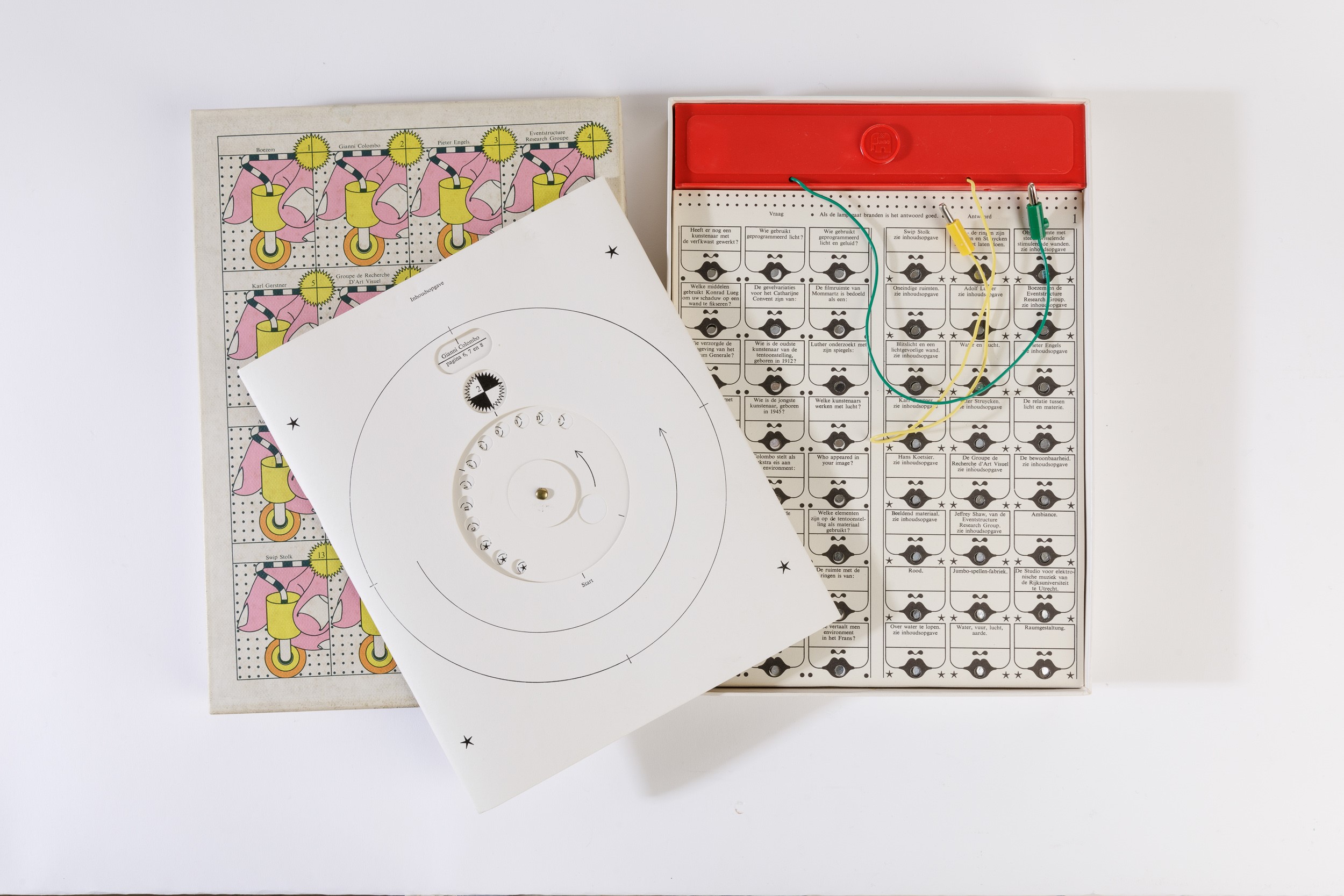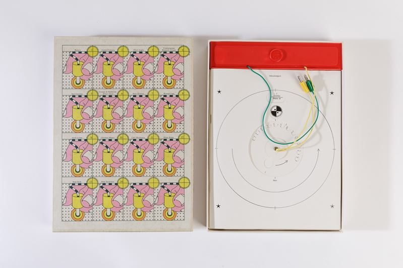 Biografie degli artisti. La scatola comprende un gioco elettronico con dispositivo a due poli, due schede perforate intercambiabili e una base rivestita in alluminio, batteria e lampadina.