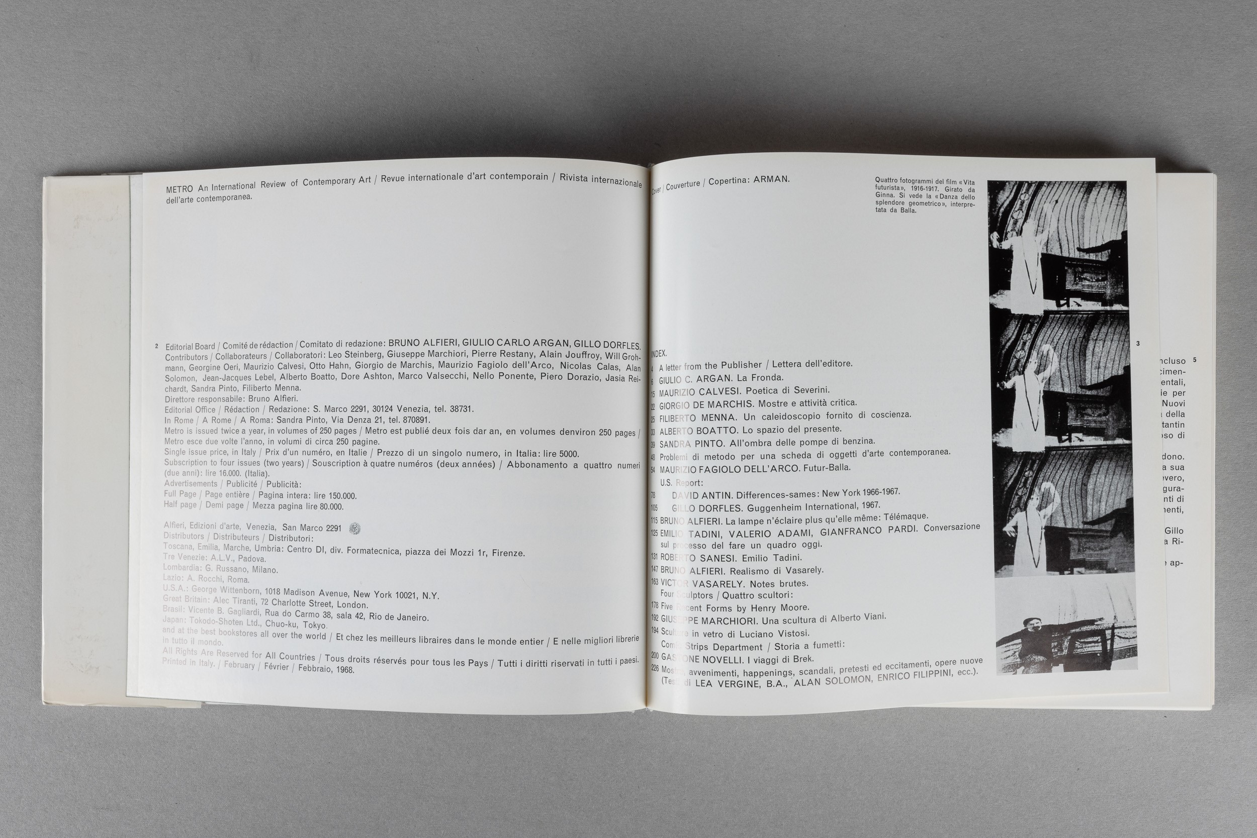 Rivista a cura di Bruno Alfieri, Giulio Carlo Argan e Gillo Dorfles, Edizioni d'arte Alfieri, Venezia, pp. 238, copertina rigida con sovracoperta
