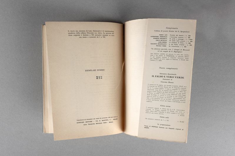 Catalogo a cura di Lina Angioletti, XXXIII quaderno della collana "Dialoghi col poeta", Edizione originale limitata a 500 esemplari, Schwarz Editore, Milano, es. 212/500