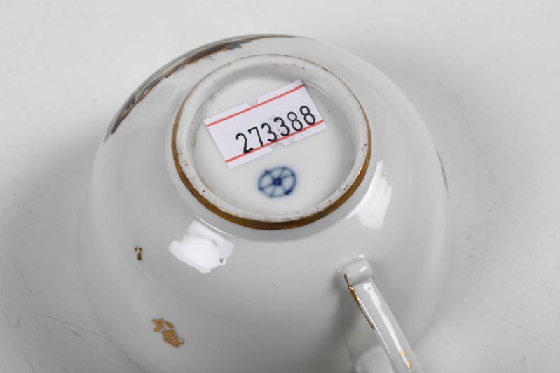 Porcelain. Brand: wheel in blue. Dimensions: cup height 4.4 cm; saucer diameter 12.8 cm. Conservation: very good