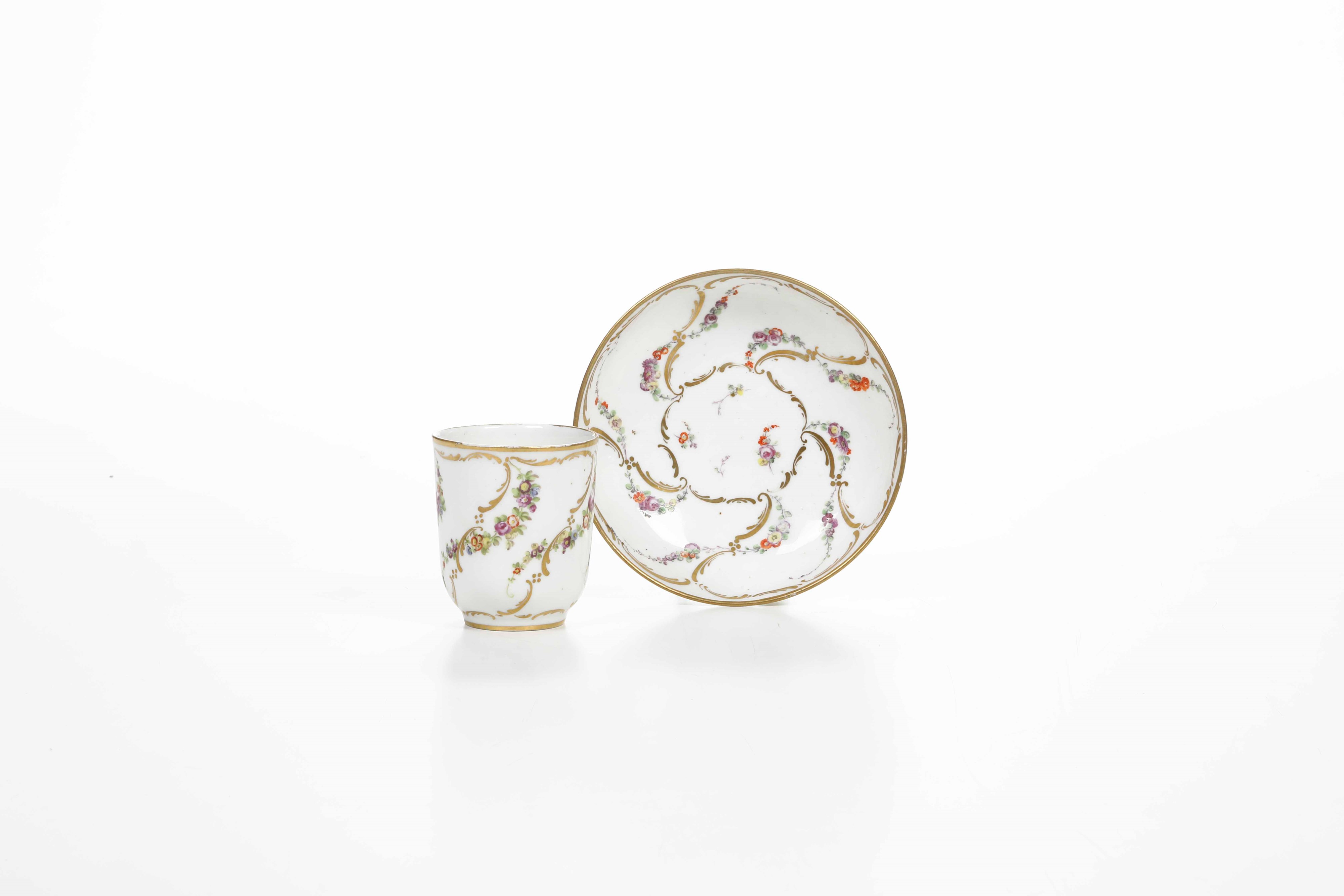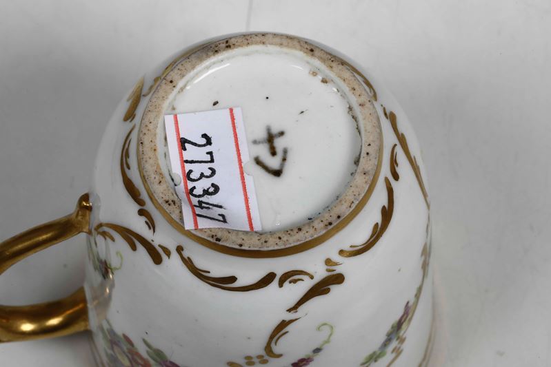 Porcelain. Brand: 'V+' in black. Dimensions: cup height 6.8 cm; saucer diameter 12.3 cm. Conservation: very good; upper thread of the cup with small gold wear Provenance: Antiquità Falanga Napoli, as per the paper label under the saucer