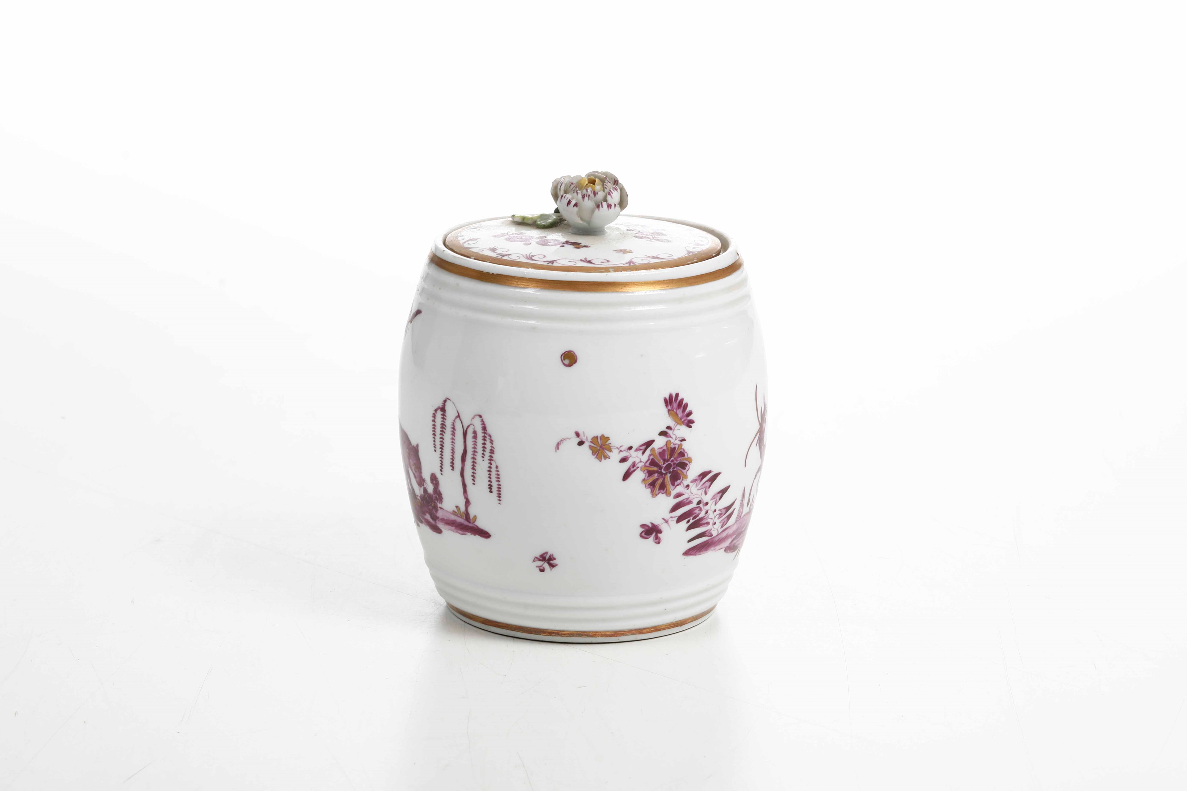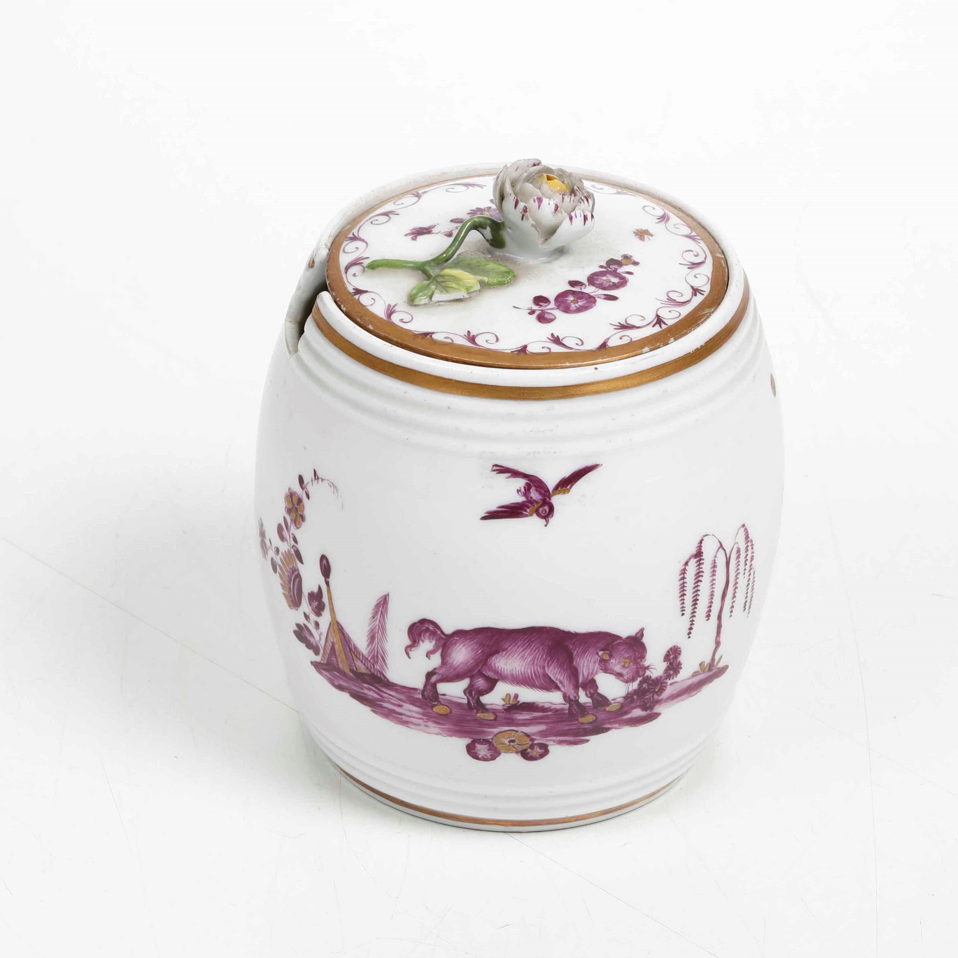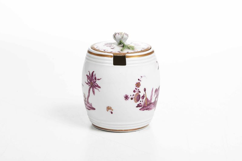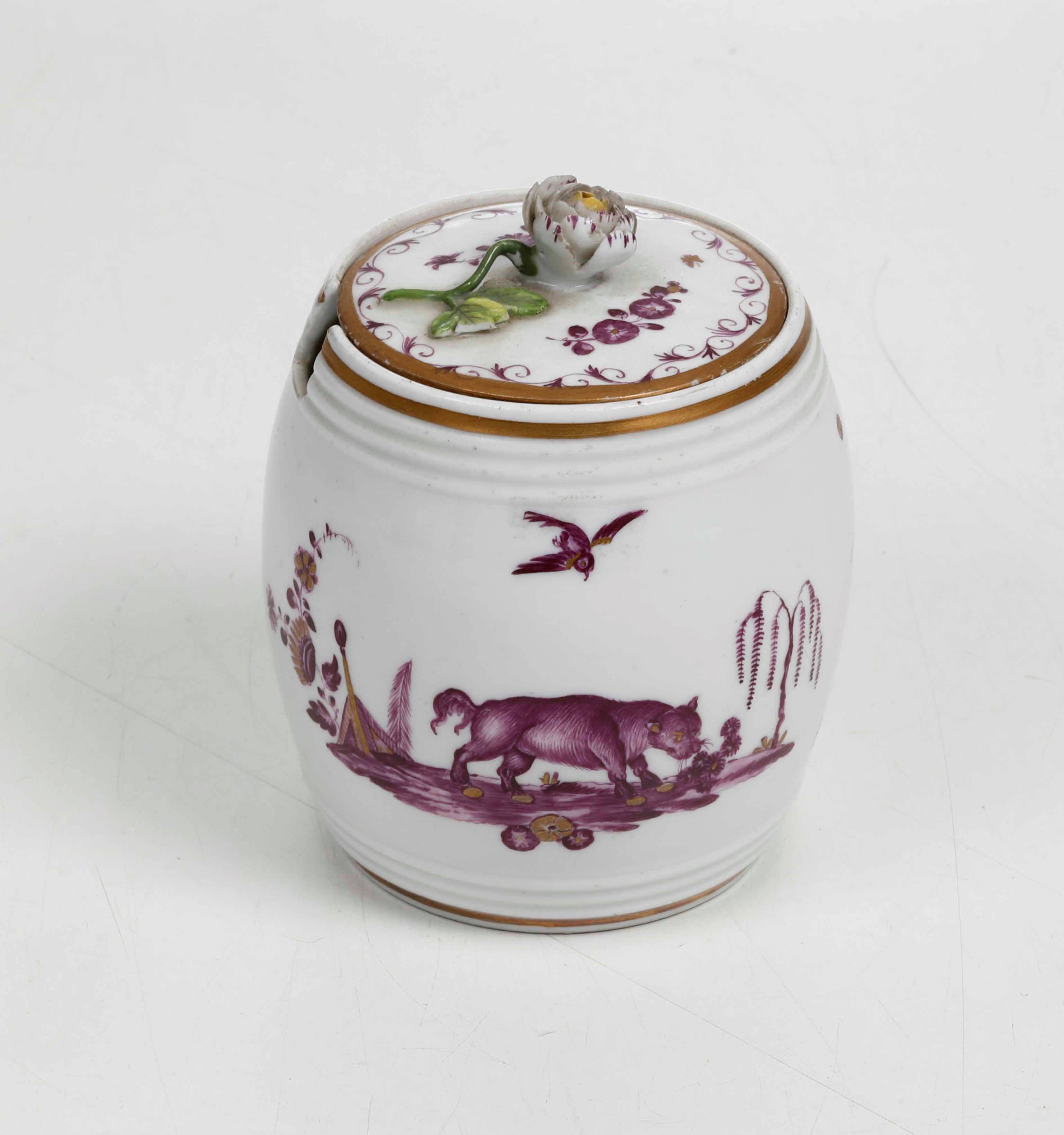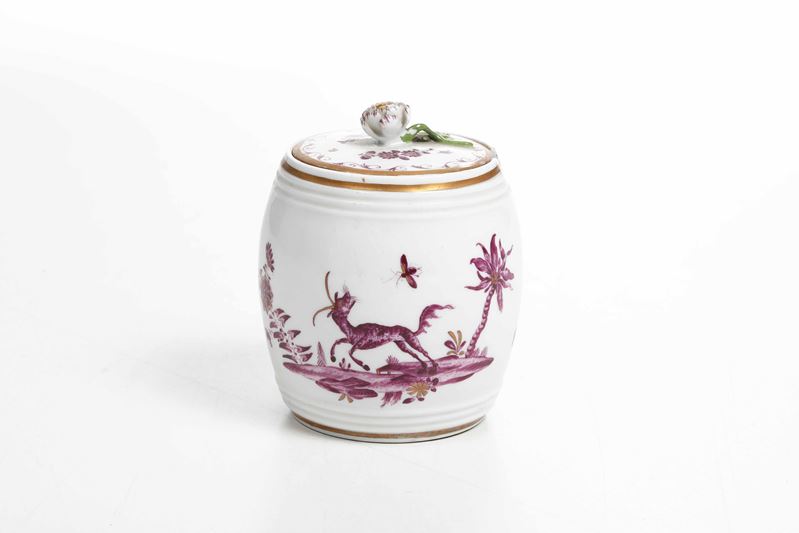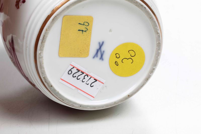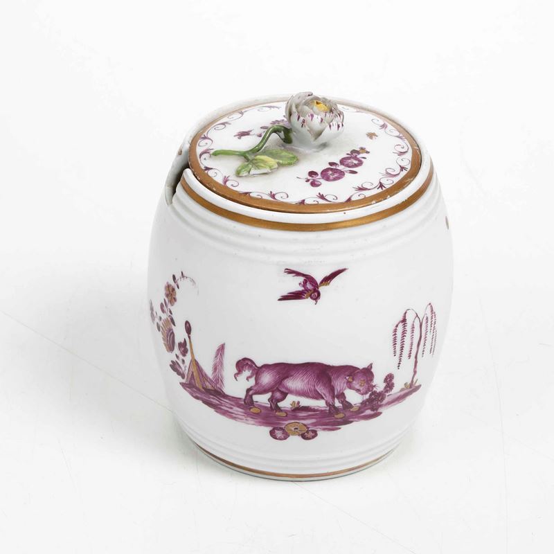 Porcelain decorated in monochrome purple and gold with fantastic animals. Mark: crossed swords in blue. Height 9.9 cm. Conservation: very good, insignificant chipping to the petals of the grip
