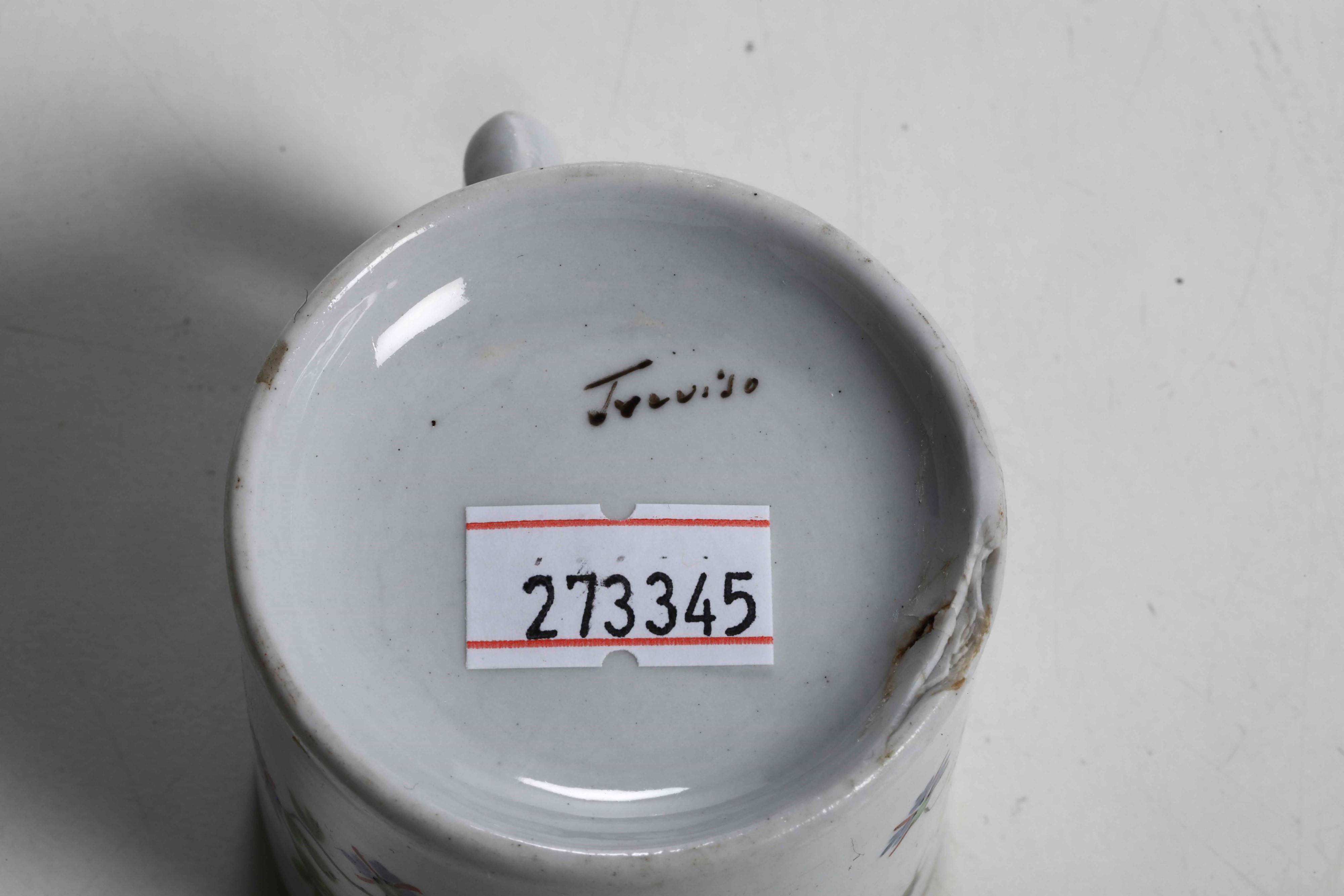 Porcelain. Brand: "Treviso" in black. Dimensions: cup height 5.4 cm; diameter 11 cm. Conservation: good, one chipped at the top of the handle of one cup; the other with a small chipping at the base; one saucer with star-shaped felting; insignificant wear to the gold of the saucers