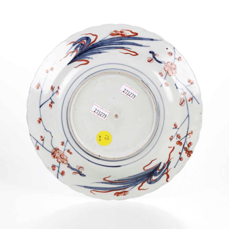 Porcelain. Brand: absent. Diameter 21.4 cm. Conservation: break at edge recomposed in old restoration between 1 and 3 o'clock; slight wear to polychrome and gold