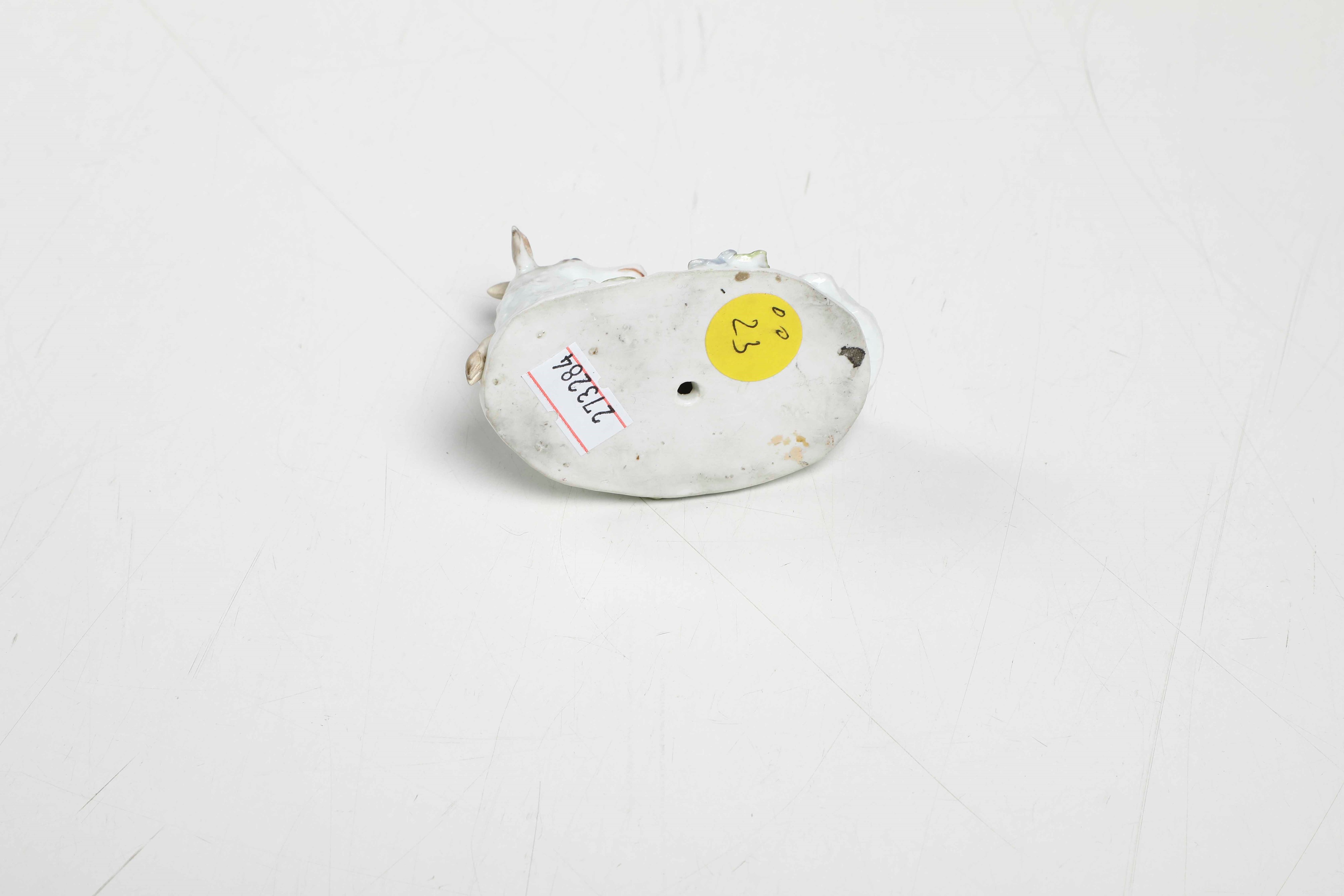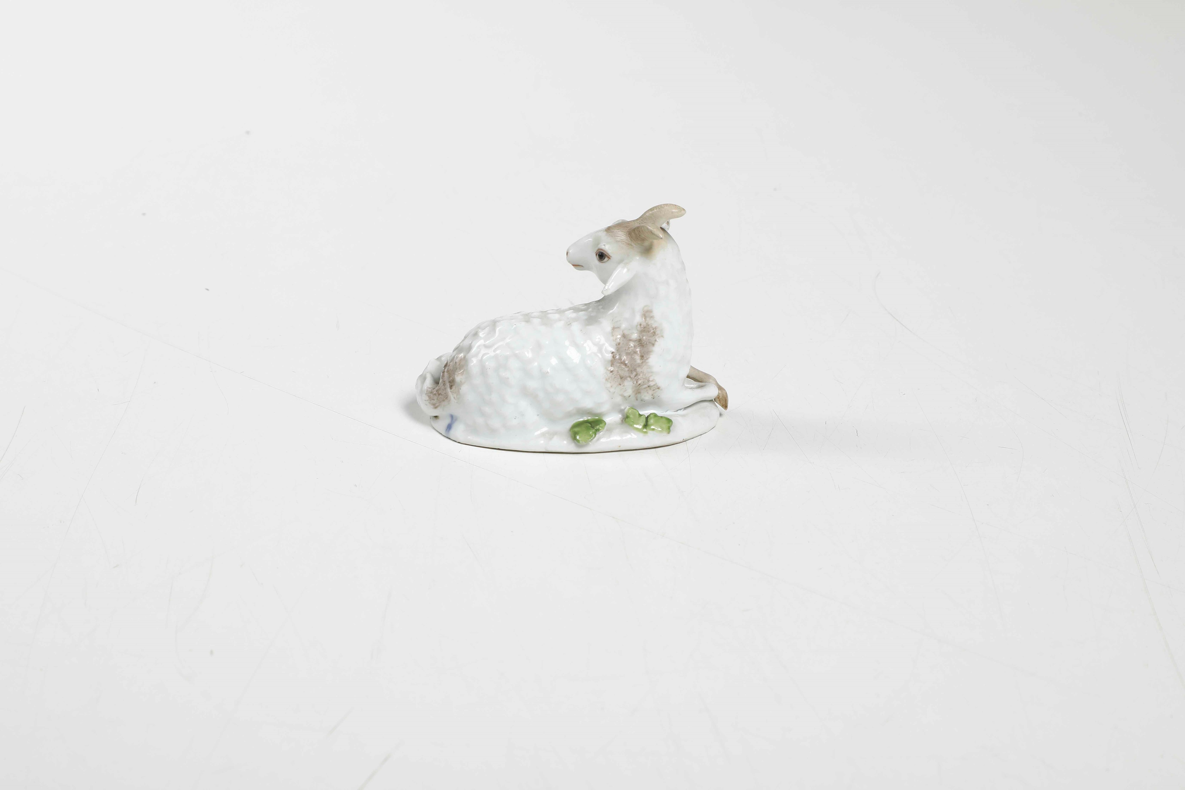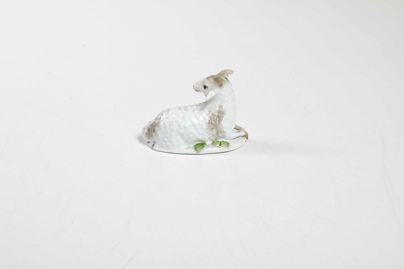 Porcelain. Mark: crossed swords in blue on the plinth. Dimensions: height 5.8 cm; 8x4.8. Conservation: left front leg and horns with old restoration