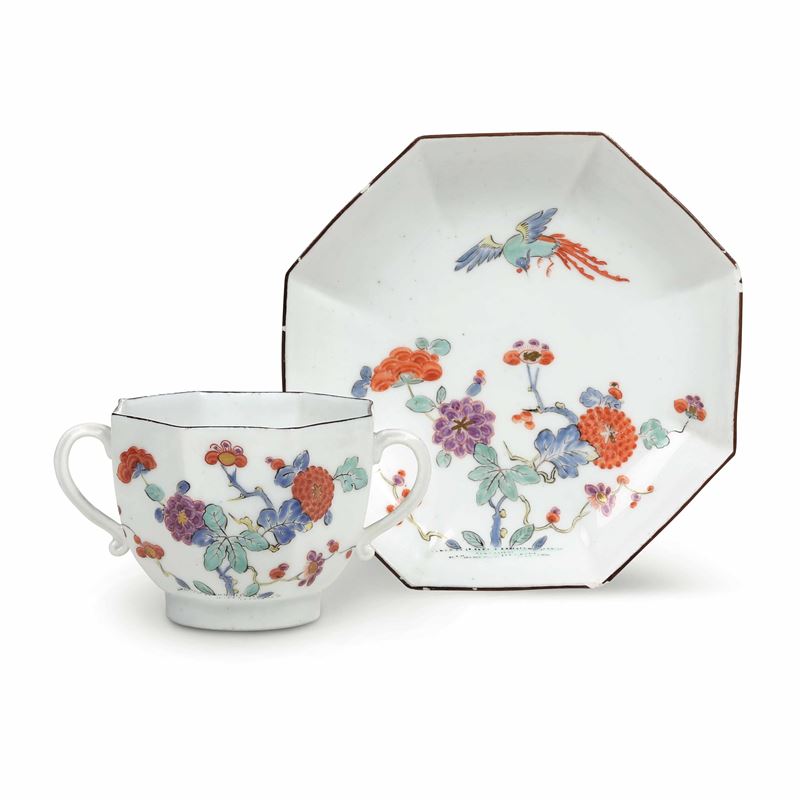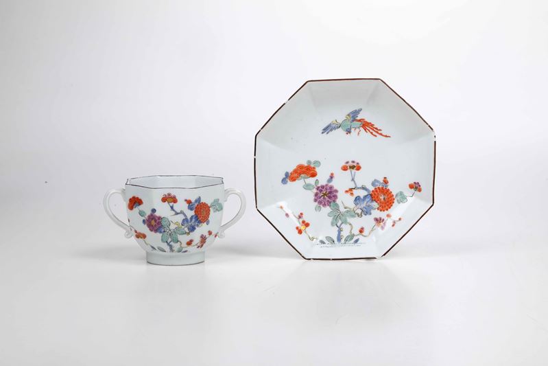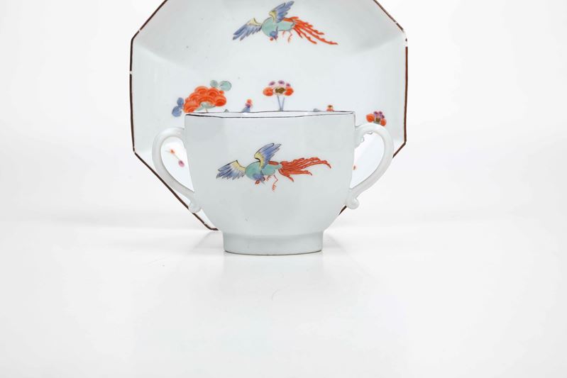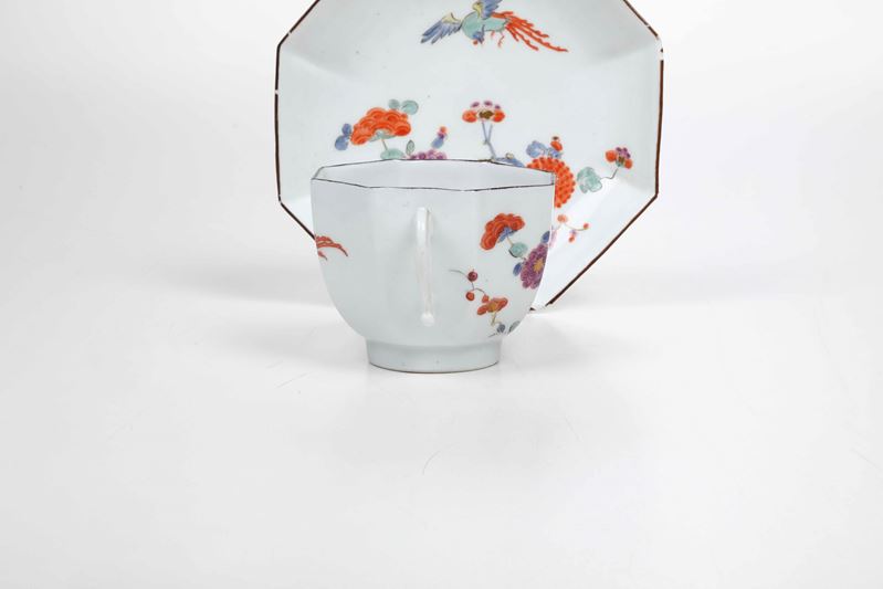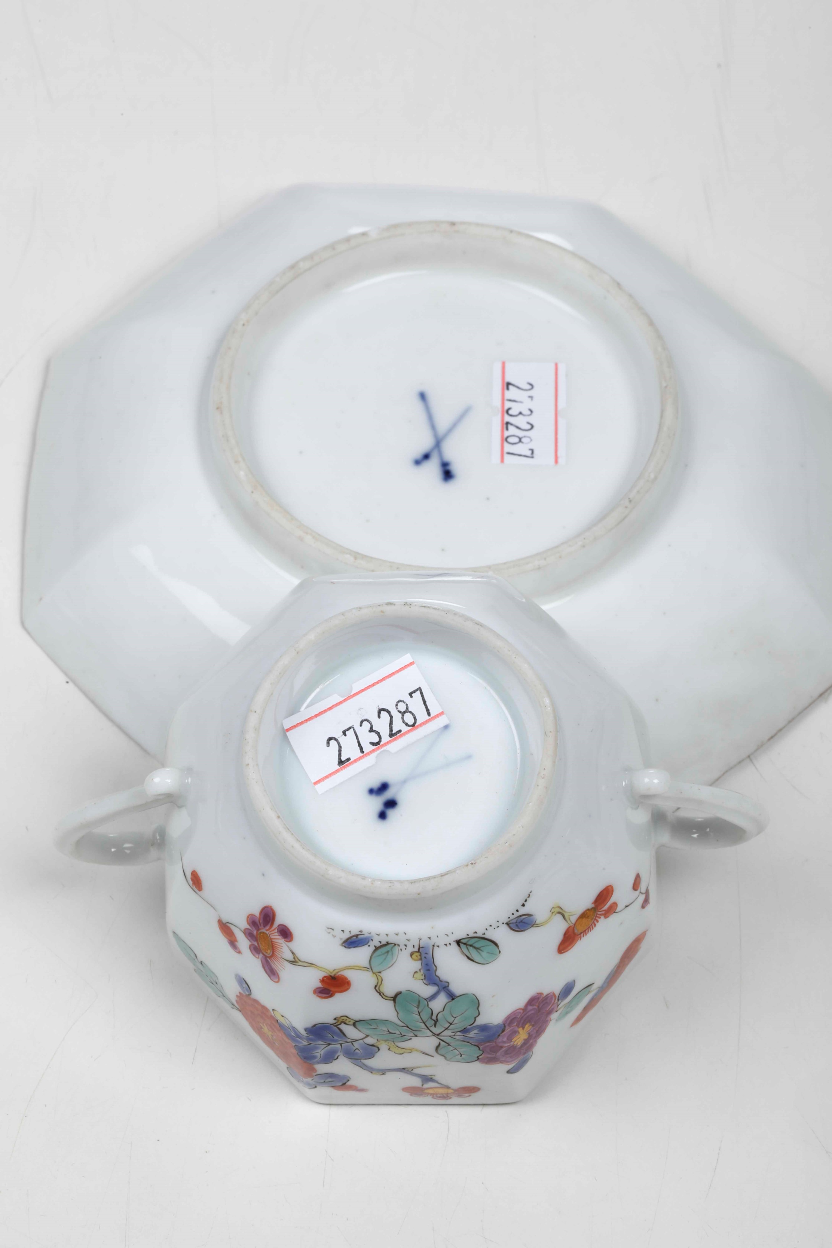 Porcelain. Brand: crossed swords in blue. Dimensions: cup height 6.1 cm; saucer diameter 14.4 cm. Conservation: very good for the cup; small chipping to the edge of the saucer