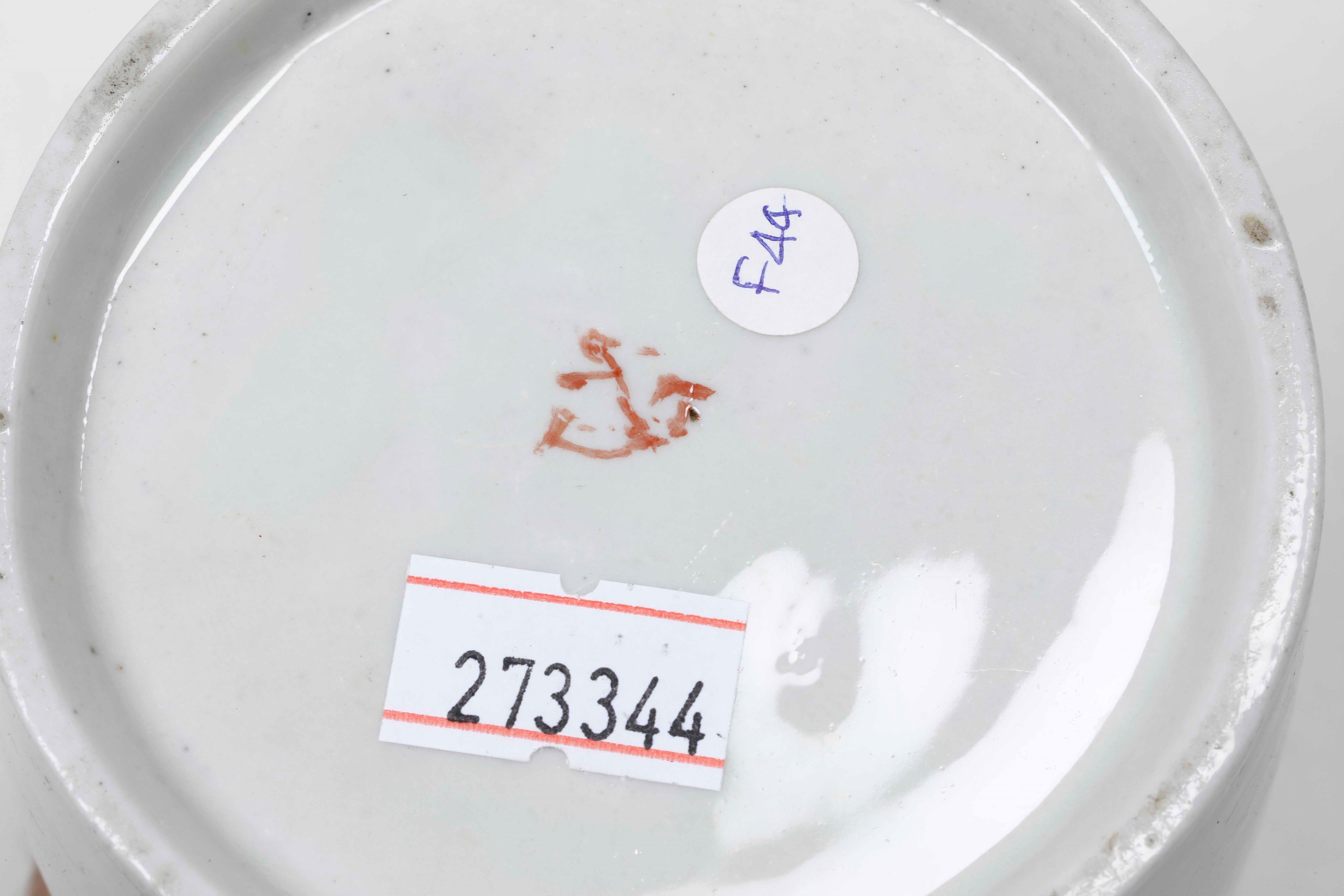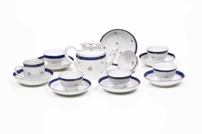 Porcelain. Brand: anchor in red. Dimensions: 6 cups height 3.8 cm; 1 cup height 5.1 cm; 7 saucers diameter 11.1 cm; teapot height 9.8 cm. Conservation: very good; one cup with felting