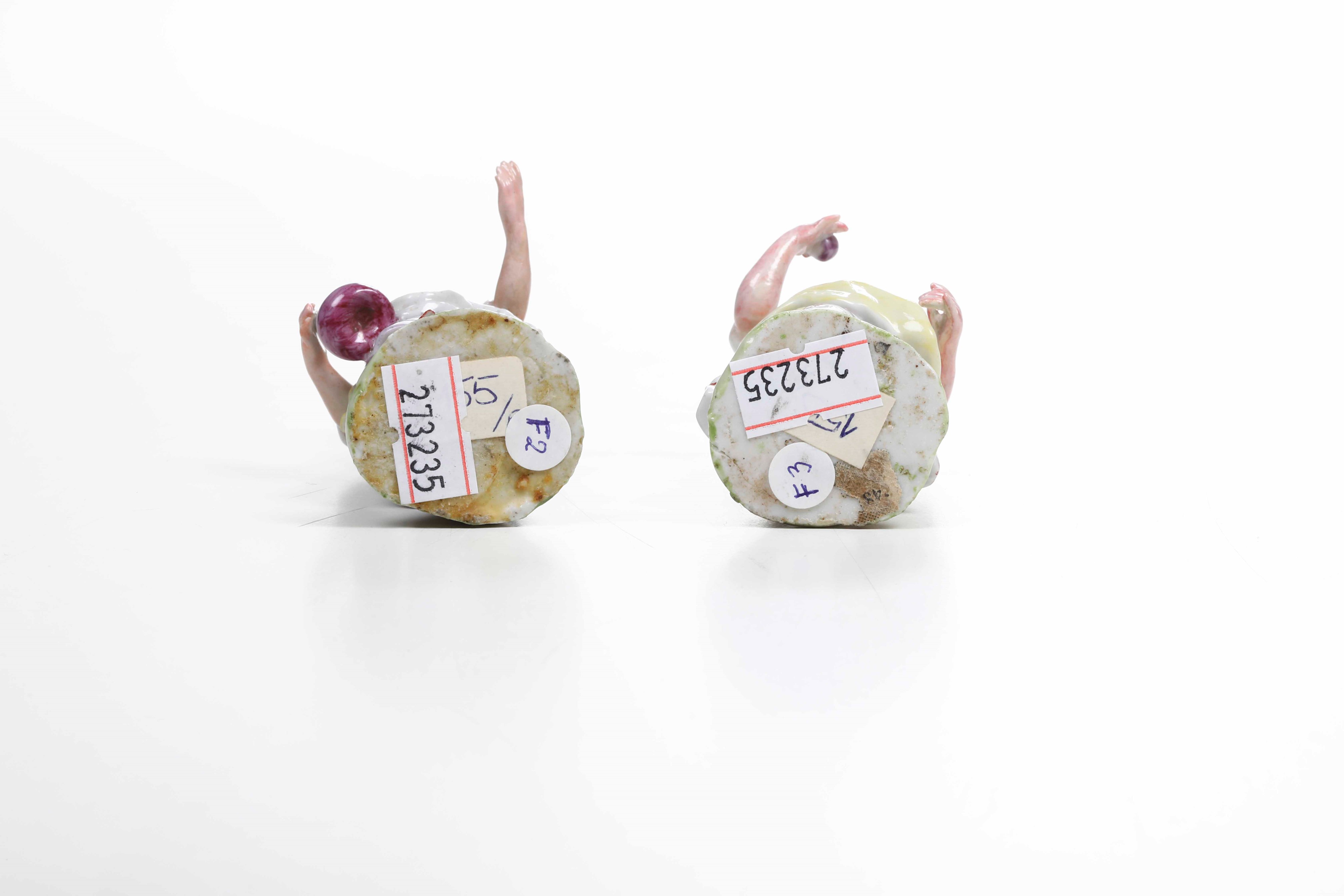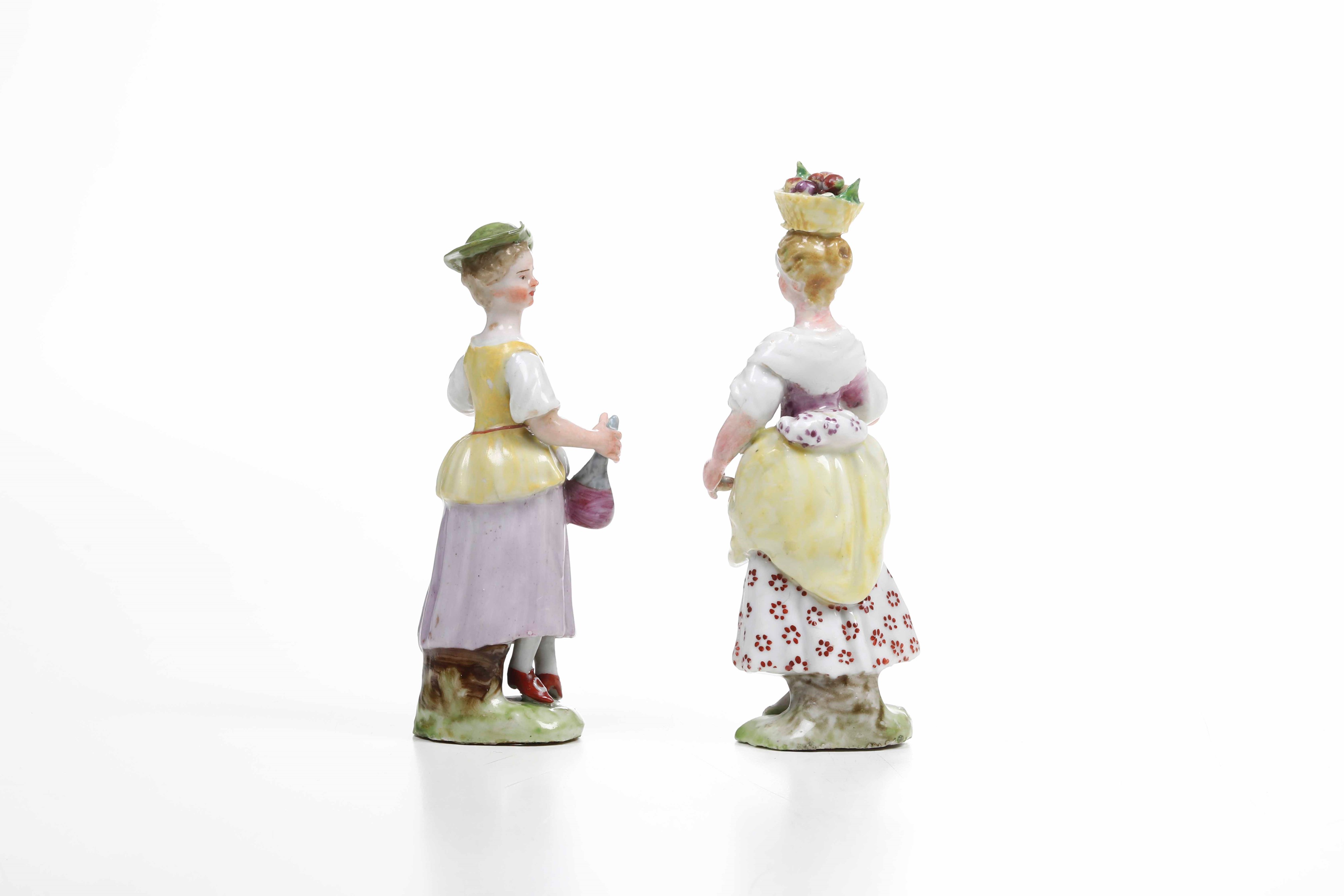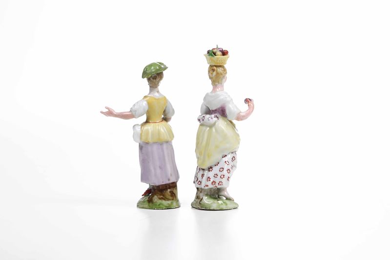 Porcelain. Brand: absent. Height 11.8 cm; 10.5 cm. Conservation: figurine with basket with left hand restored and insignificant restorations to the green vegetation of the basket; the other figurine with left hand and part of the brim of the hat reassembled in restoration