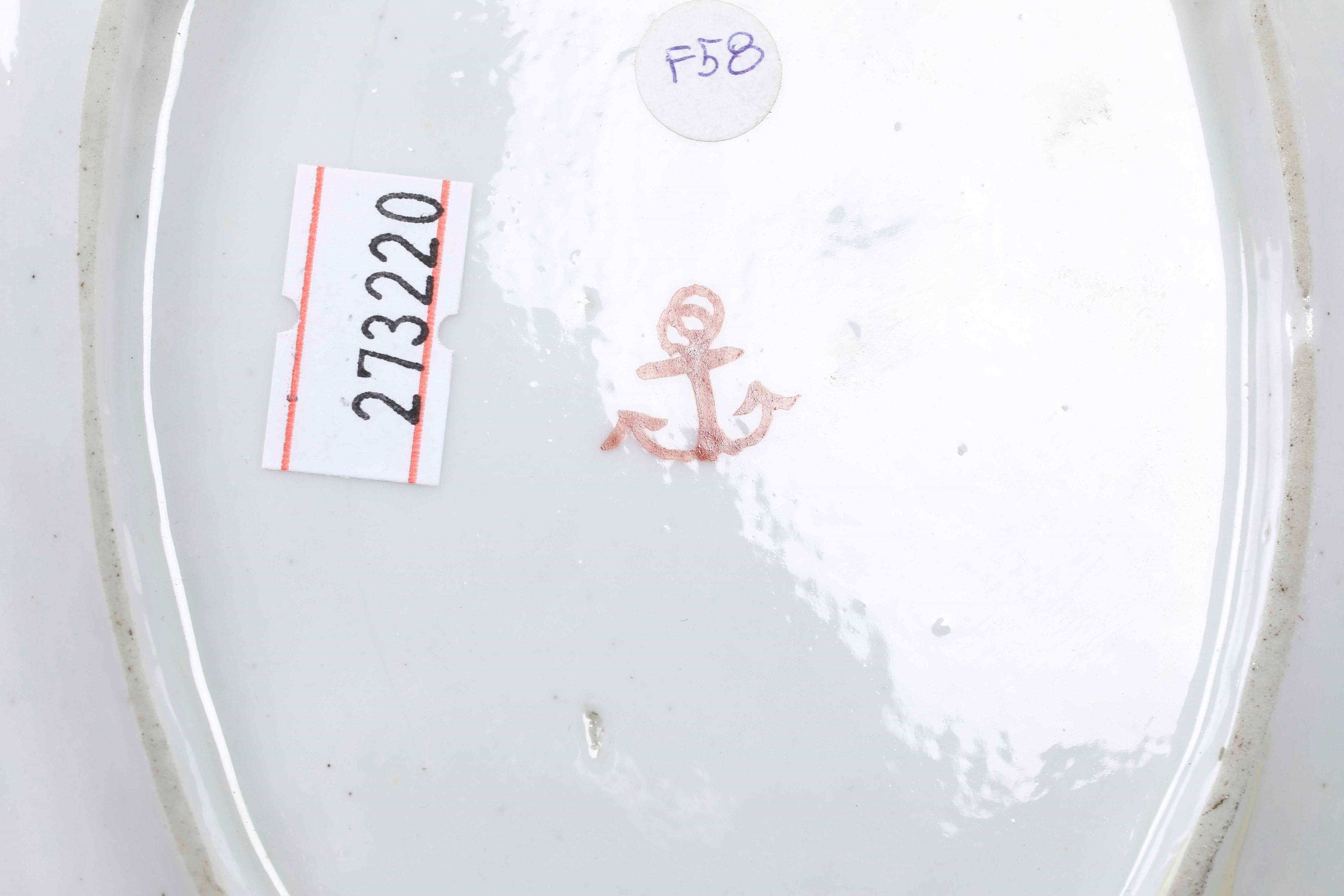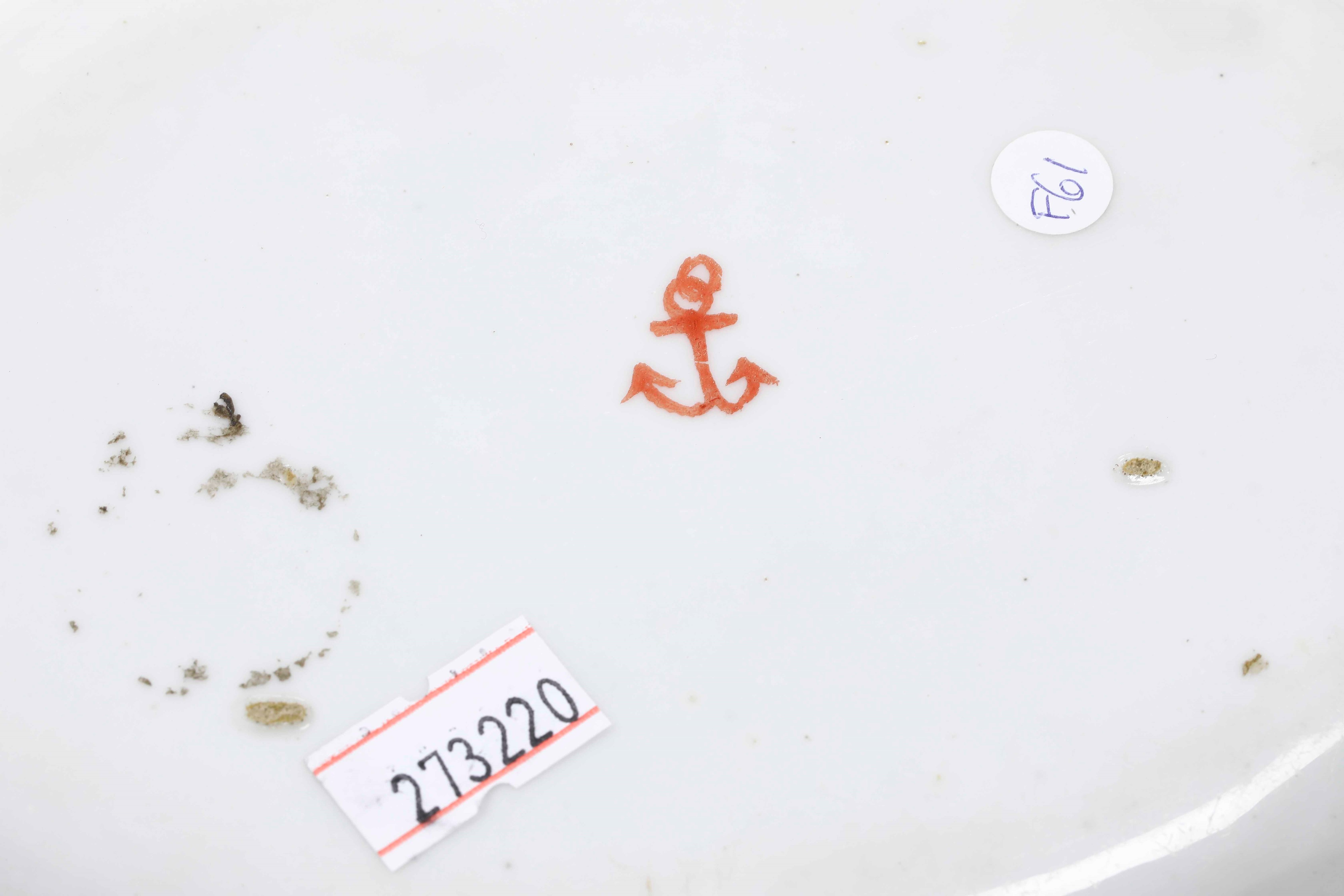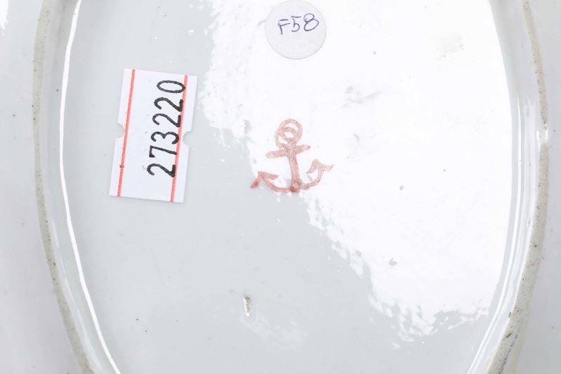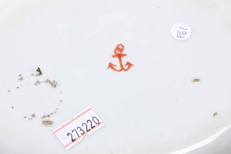 Porcelain. Brand: anchor in red. Dimensions: 18.2x14.9 cm; 18x13. Conservation: very good; insignificant wear; blue-rimmed tray with insignificant chipping to the rear edge