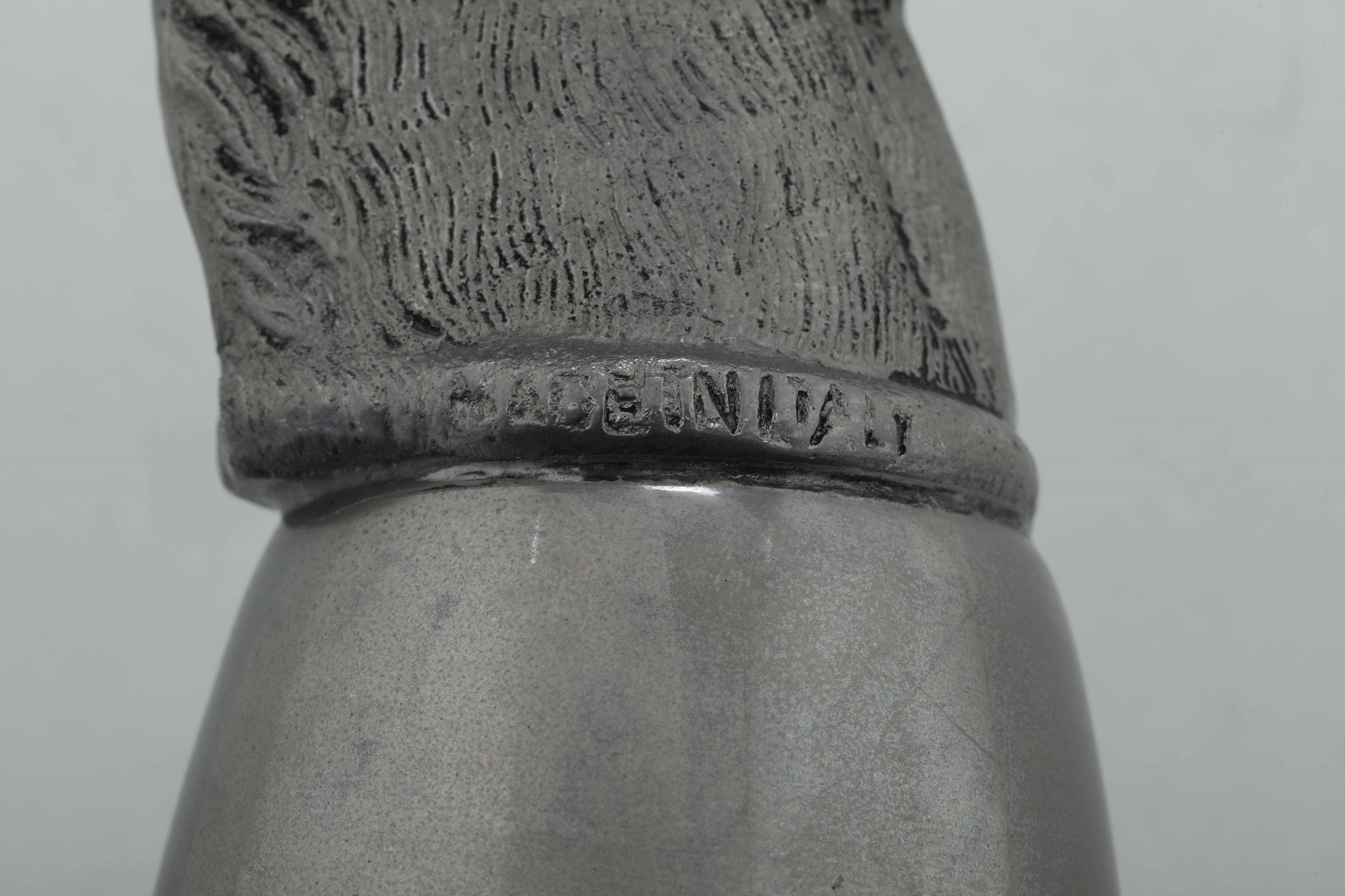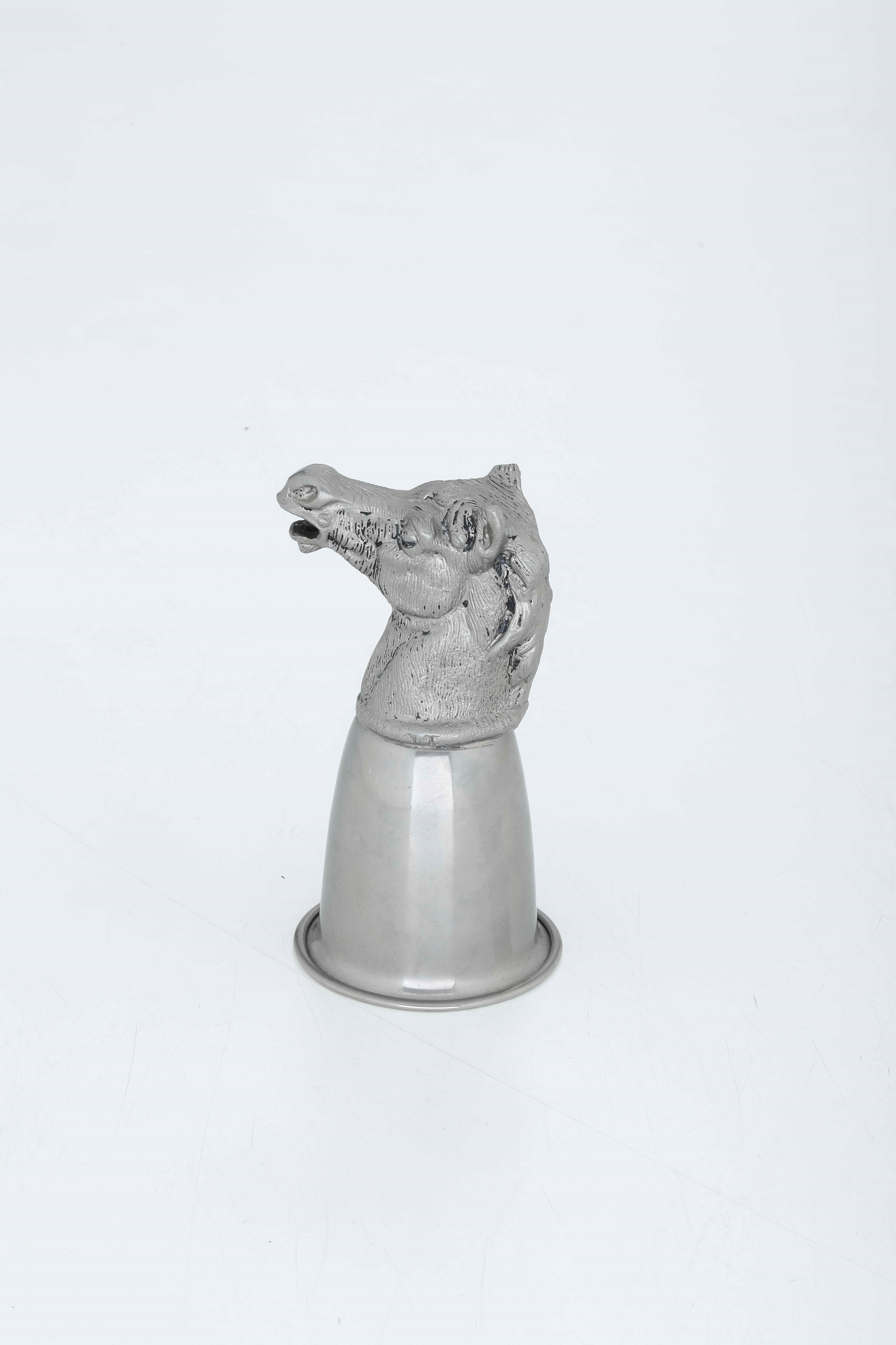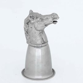 Bicchiere in metallo con testa di cavallo a firma Gucci. Italia XX secolo