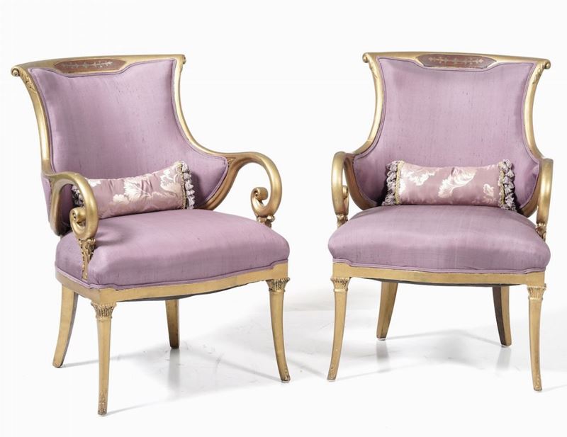 Coppia di poltrone in legno dorato, XX secolo