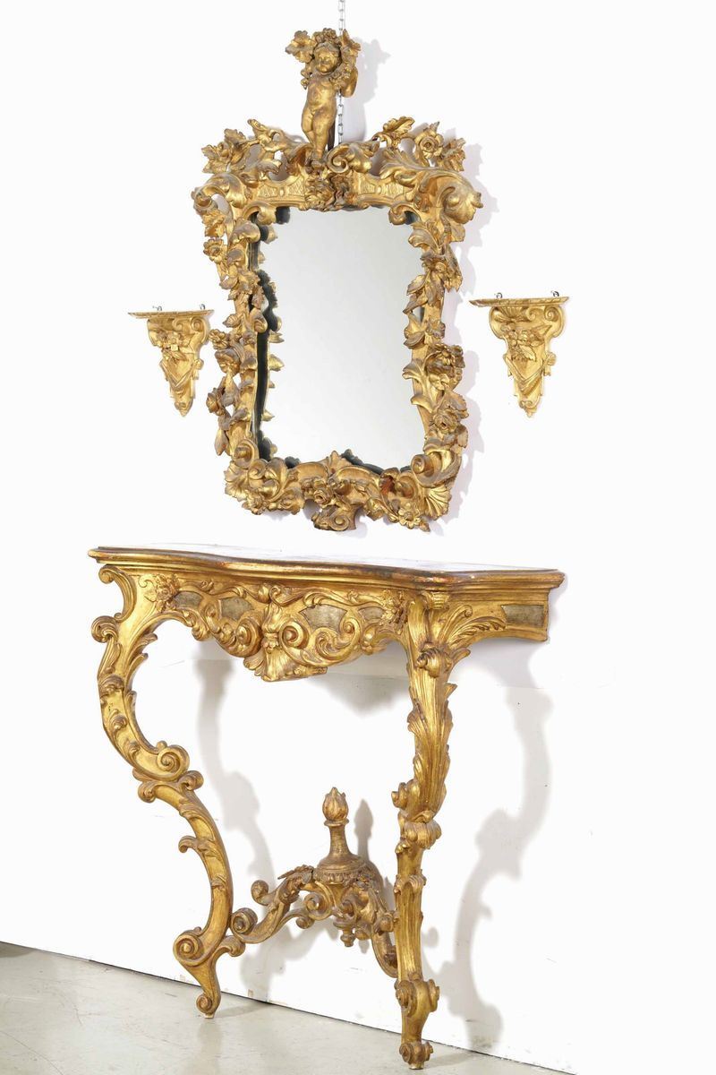 Insieme di consolle con specchiera e coppia di mensoline in legno intagliato e dorato.