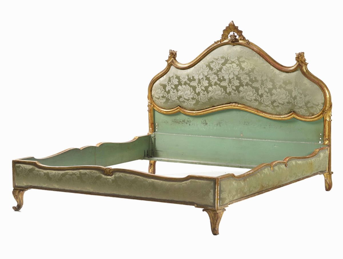 Testata da letto con struttura in legno dorato e rivestimento in broccato verde
