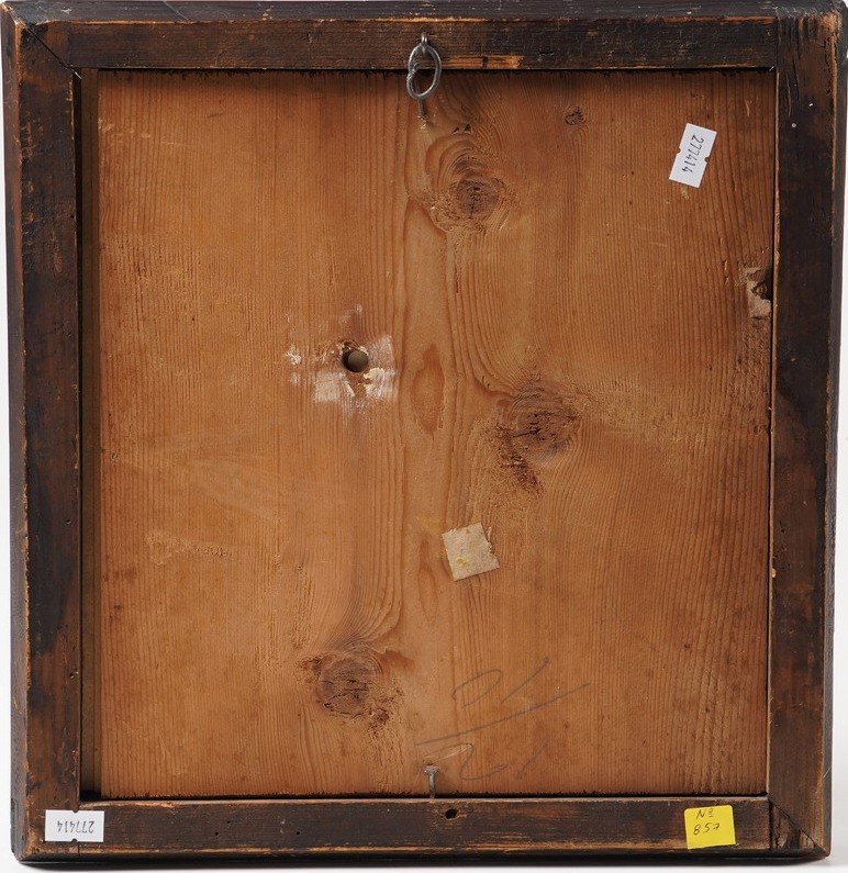 Impressione presumibilmente antica, che riprende l'originale cinquecentesco tratto dal frontespizio della serie dedicata alla vita della vergine, incisa nel 1511. Si tratta della sola parte centrale del foglio mancante del testo stampato in alto e al piede della raffigurazione silografica. Nessuna filigrana evidente. Proposta come stampa decorativa.