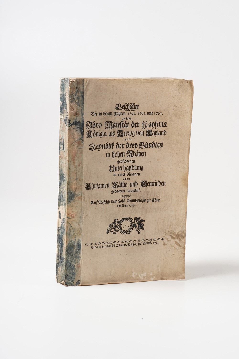 In-4°. Volume privo di rilegatura conservato entro scatola in plexiglass. LXXII + (14)+ 114+76+40+(40)pp. Raccolta di scritti di carattere giuridico e amministrativo, oltre che di natura ecclesiastica riguardanti i “Comuni delle Tre Leghe”.