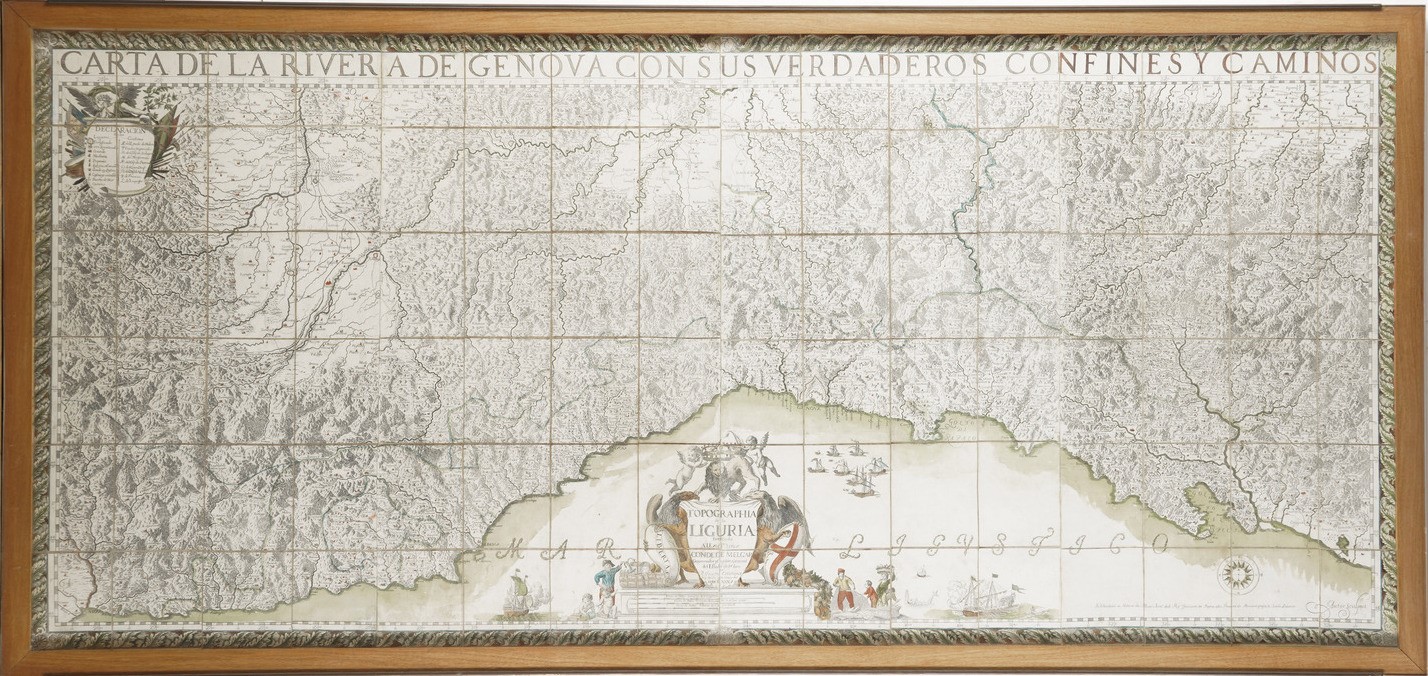 Grande e magnifica carta geografica della Liguria, considerata da molti la più celebre e famosa tra quelle realizzate. Il nostro esemplare è diviso in 96 riquadri applicati su tela antica. Bella coloritura in colori tenui, presumibilmente coeva. Il tutto entro cornice del secolo XX. (rottura al vetro di protezione)