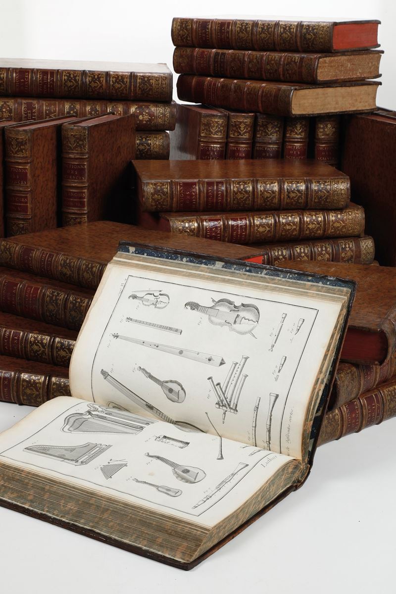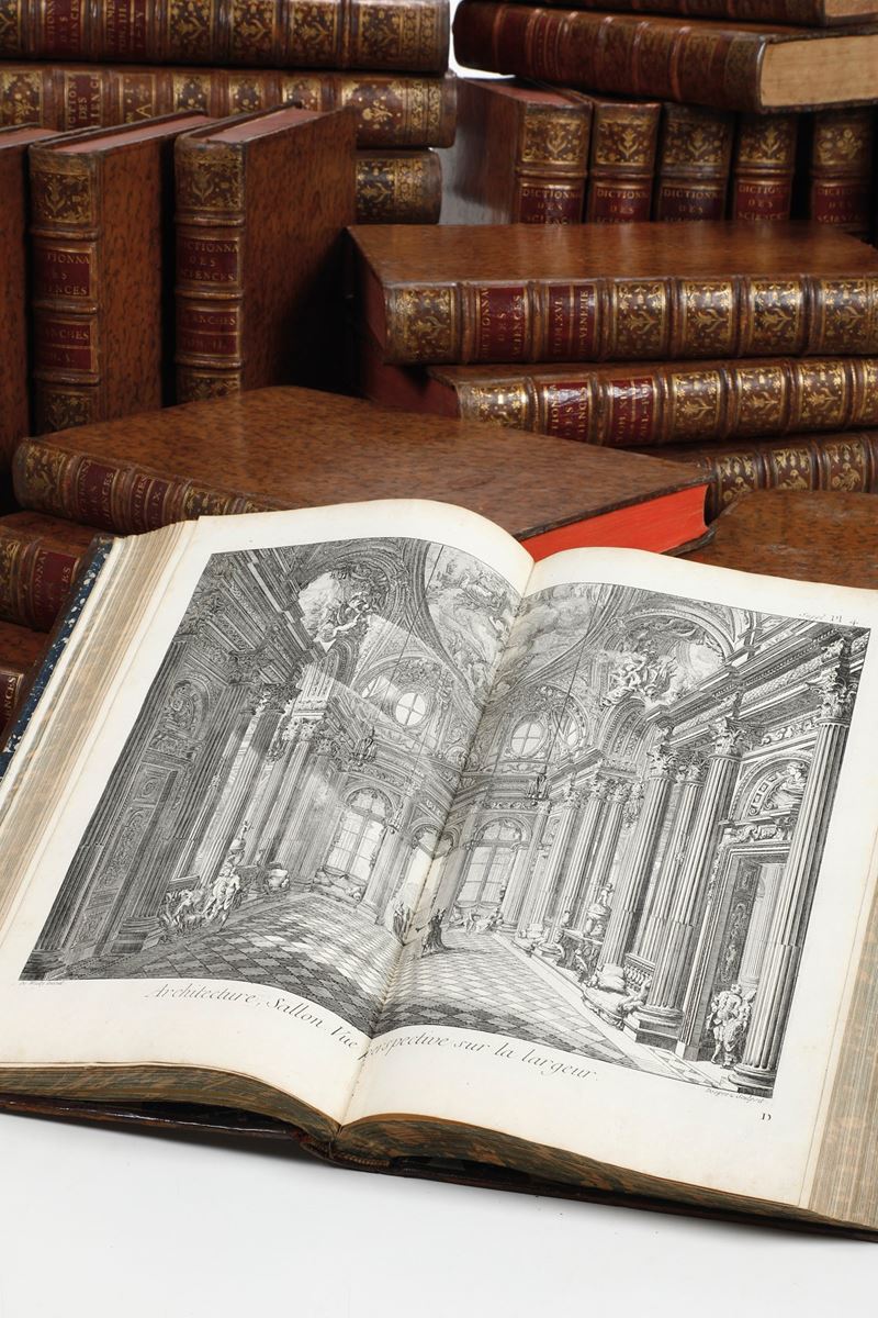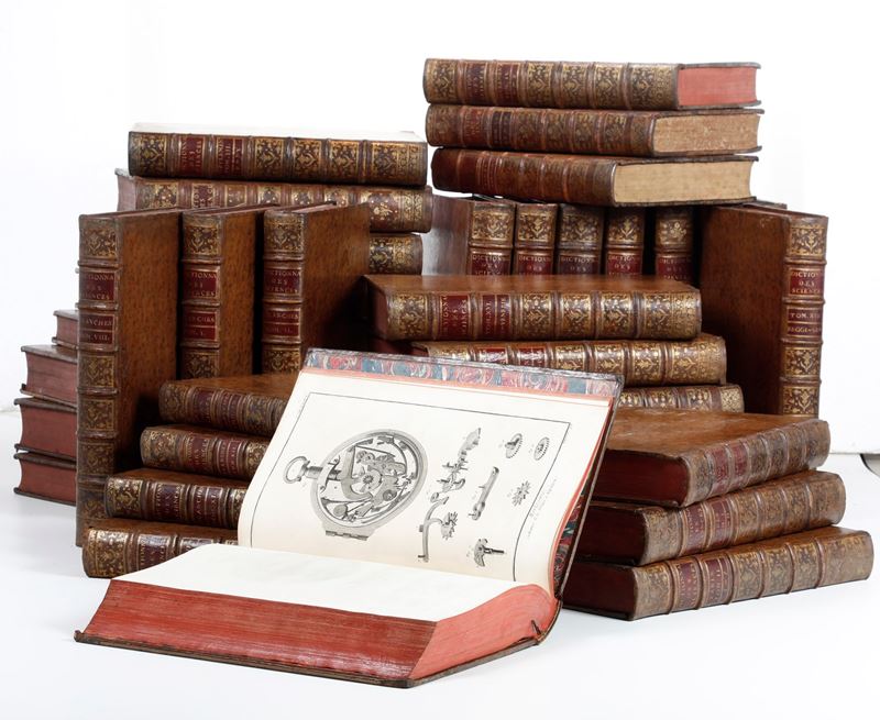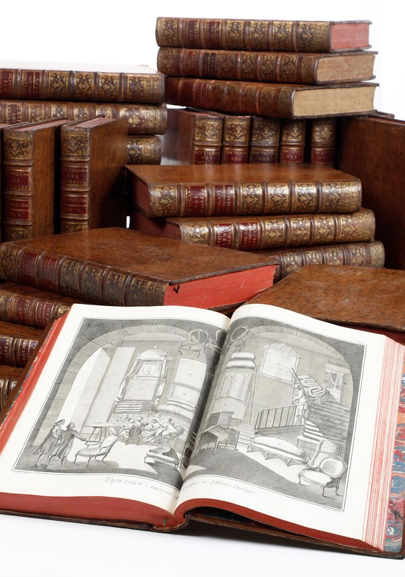PRIMA EDIZIONE del monumentale contributo dell'Illuminismo alla conoscenza universale, in buon esemplare in rilegatura coeva, abbastanza uniforme (si riscontrano differenze nella coloritura dei tagli e nell’impostazione del titolo al tomo primo di testo) in piena pelle marmorizzata.
