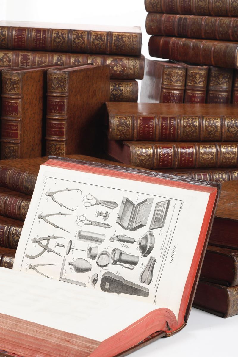 Denis Diderot and Jean d'Alembert Encyclopédie, ou dictionnaire raisonné des sciences, des arts et des métiers, par une société de gens de lettres (Nouveau dictionnaire, pour servir de supplément). Paris: Briasson, David, Le Breton and Durand, 1751-1757 (volumi da 1 a 7) Neuchâtel: Samuel Faulche & Cie, 1765 (volumi dall’8 al 17); Plances: Paris: Briasson etc., 1762-1777; 11 volumi +1 pubblicato da Panckoucke 1777 ; Supplement: Amsterdam: Rey,1776- 1777; 4 volumi. Table: 2 volumi a Paris Chez Panckoucke e ad Amsterdam, 1780.