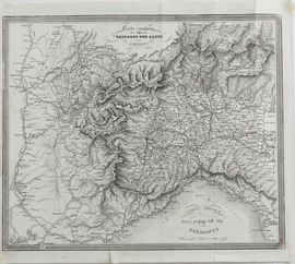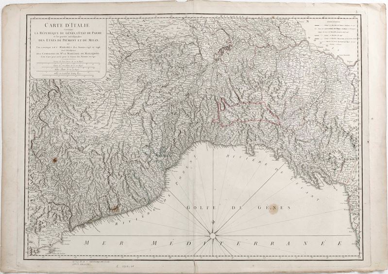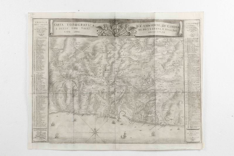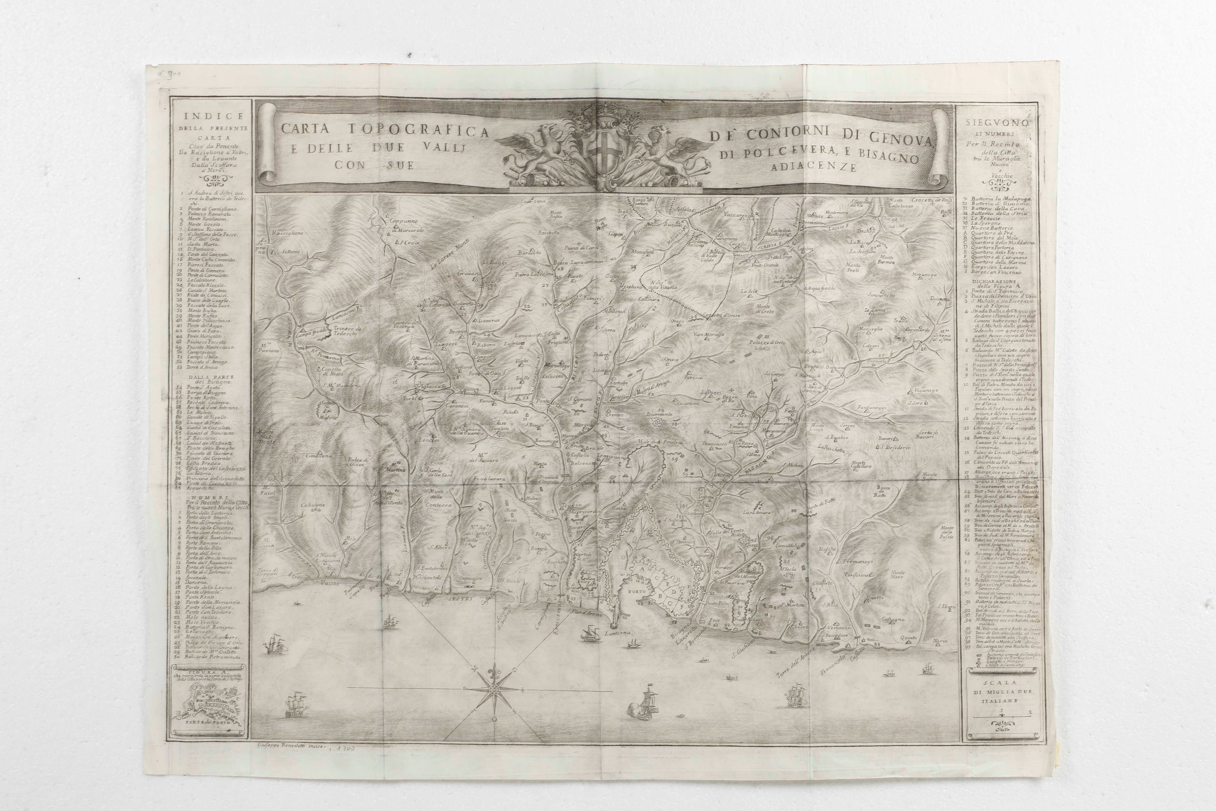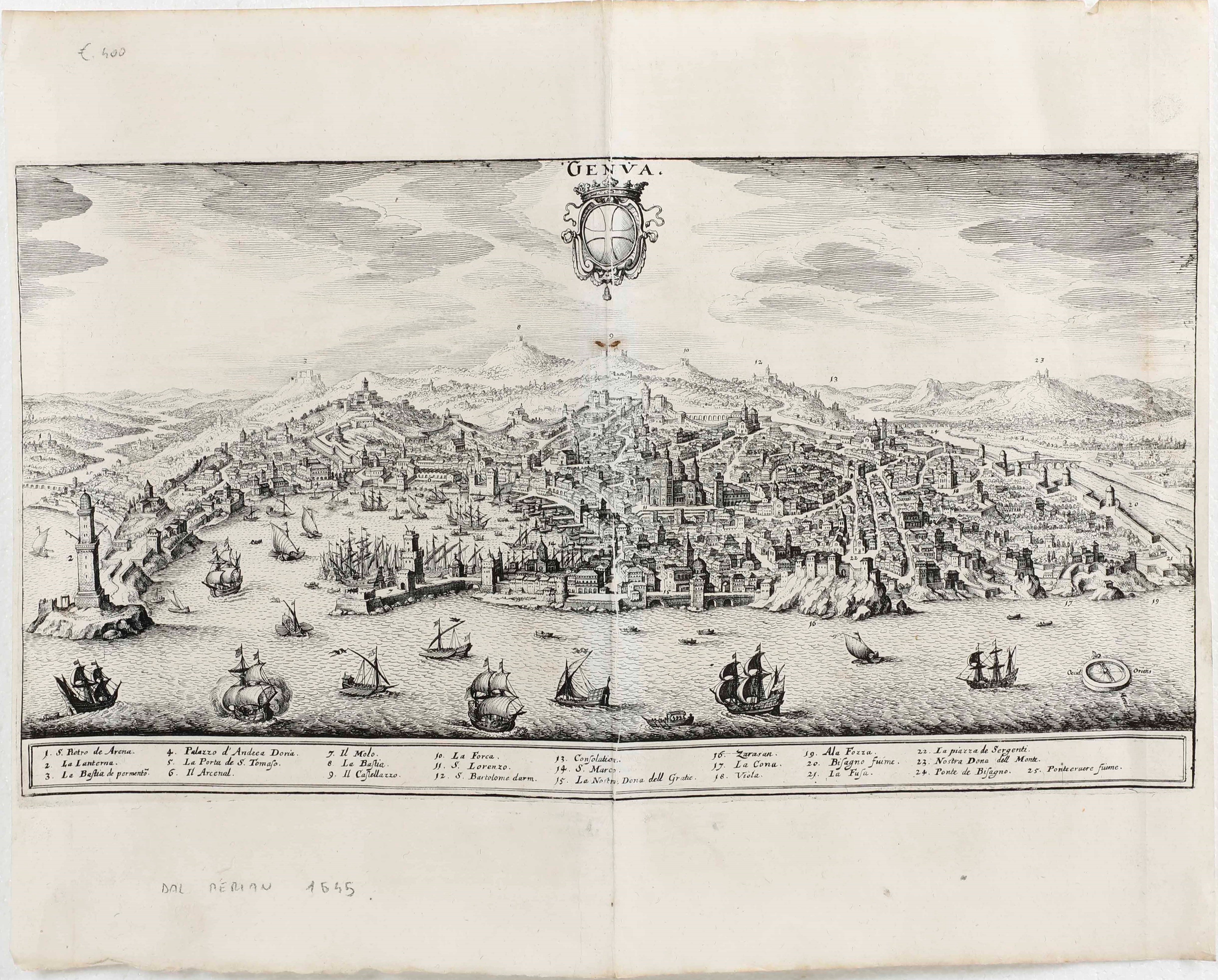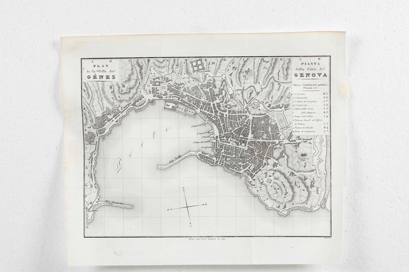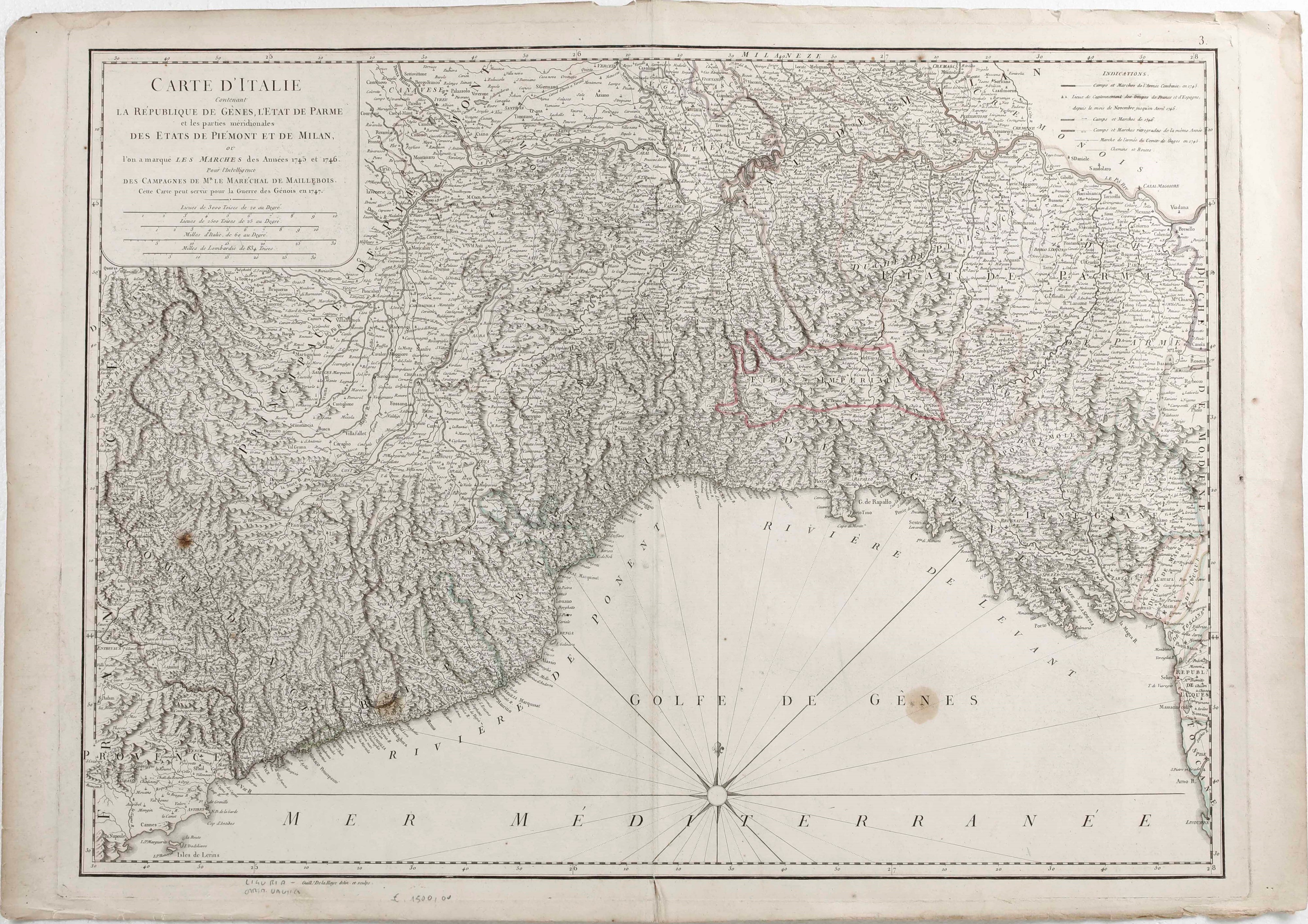 Genua - Merian, 1645. 21x38 cm /Carte routiere des differents passages des alpes et du Piemont. Milano, presso Ferdinando Artaria e figli. 42x50 cm. / Pianta della città di genova. Milano, presso Ferd. Artaria e figli. 19x26 cm. / Carta topografica de’ contorni di Genova e delle due valli di Polcevera e Bisagno con sue adiacenze. Incisa da Giuseppe Benedetti, 1700. 40x54 cm./ Carte d’Italie. La république de Gènes, l’Etat de Parme...1745/46, cm. 68x50