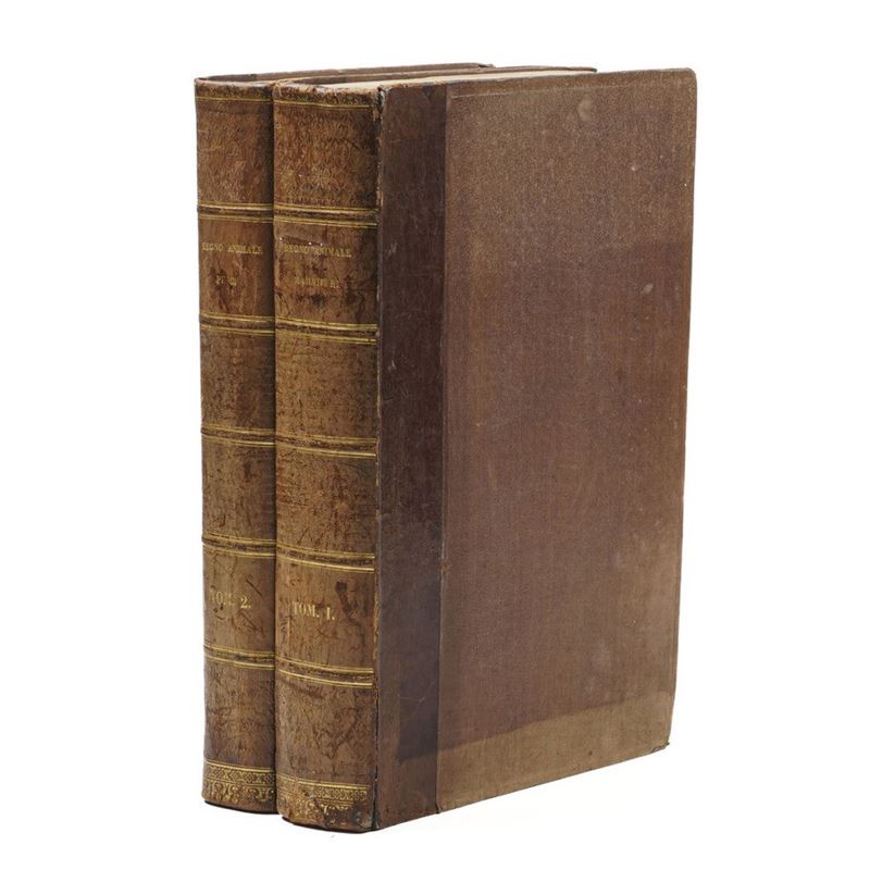 Due volumi in folio. Rilegature coeve in mezza pelle. Si tratta in realtà di due edizioni distinte, riunite con una rilegatura uniforme recante ai dorsi il titolo di regno animale, tomi I e II. Il volume dedicato ai pesci contiene infine 124 tavole incise in rame e finemente colorate. Le ultime 10 tavole presentano errori di numerazione. Il volume dedicato ai mammiferi contiene 220 tavole incise in bella coloritura