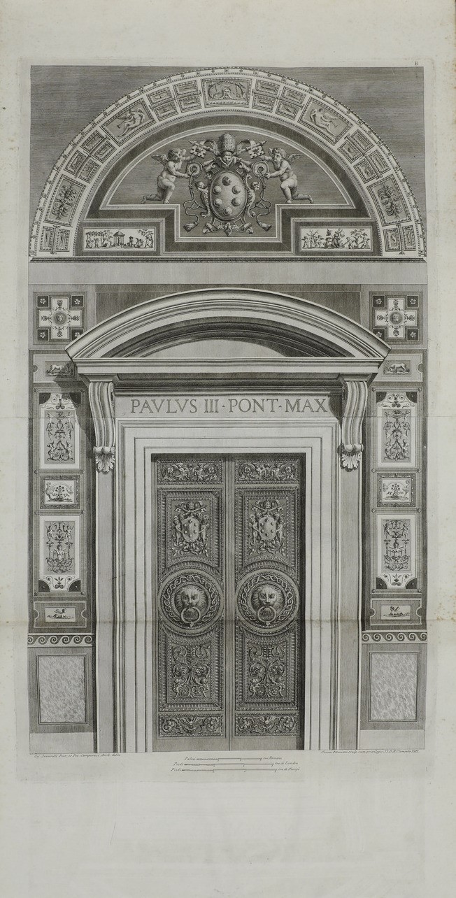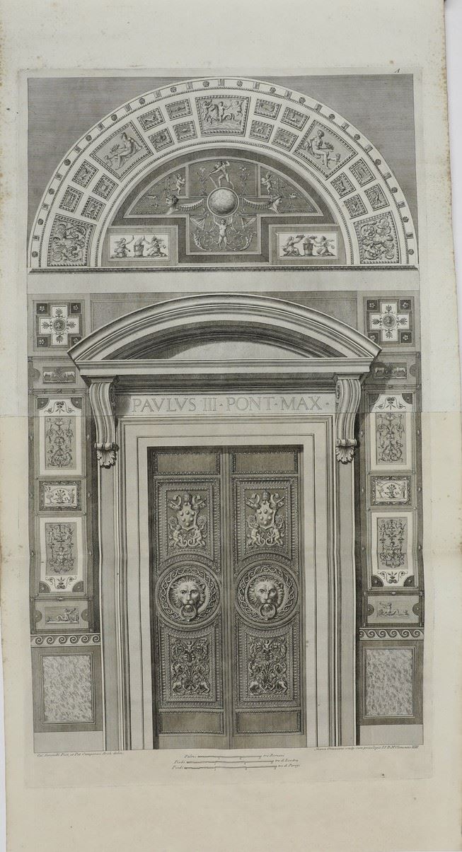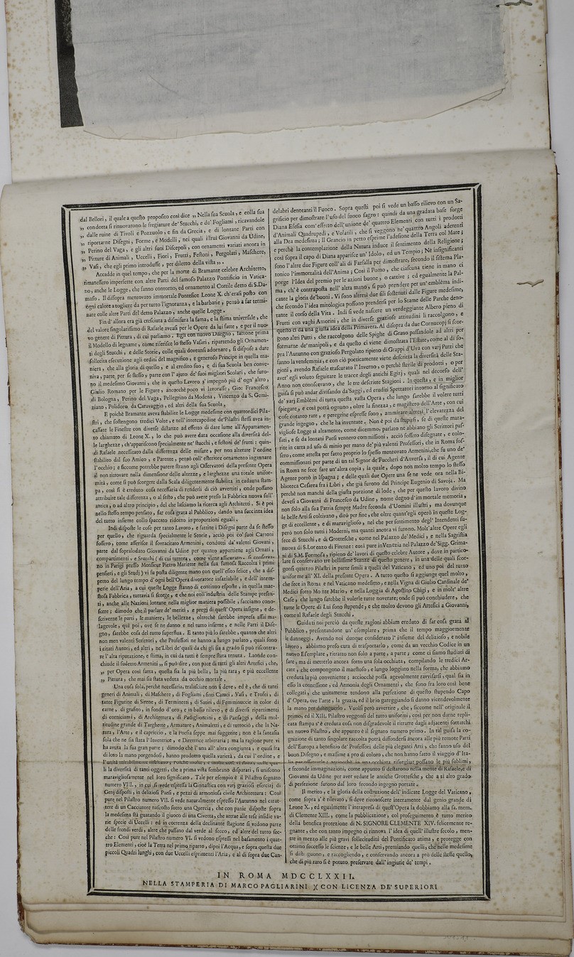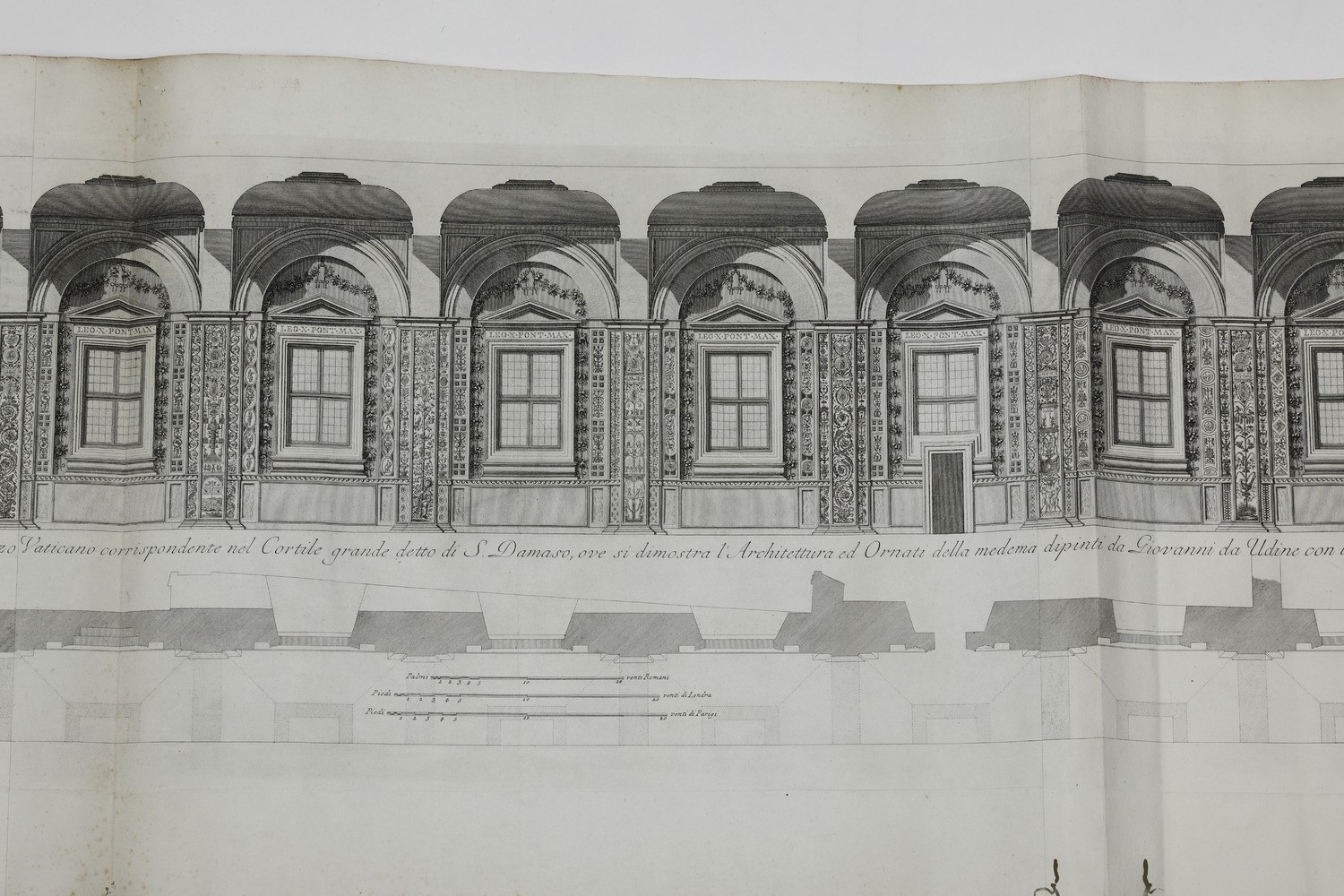 Grande album in-folio. Rilegatura coeva in mezza pelle. La nostra copia si compone di: 1 carta bianca di guardia a protezione, un primo frontespizio calcografico che reca la seguente dicitura "Terza ed ultima parte delle Logge di Rafaele nel Vaticano, che contiene il compimento degli ornati, e de-bassirilievi antichi esistenti nelle Logge medesime pubblicata in Roma l'anno 1777", folio stampato recto e verso "agli amatori delle belle arti...e in fine in Roma nella stamperia di Marco Pagliarini 1772" secondo frontespizio calcografico raffigurante le "Loggie di Raffaele nel Vaticano inciso da Giovanni Volpato". Grande tavola ripiegata incisa da Giovanni Ottaviani, su disegno di Savorelli e Camporesi, tavola ripiegata con la dicitura "Paulus III pont. Max. incisa da Giovanni Ottaviani", tavola ripiegata con la dicitura "Paulus III pont. Max. incisa da Giovanni Ottaviani", prima grande tavola ripiegata incisa da Giovanni Volpato, Roma 1774, seconda grande tavola ripiegata incisa da Giovanni Volpato, terza grande tavola incisa da Giovanni Volpato, Roma 1774, quarta grande tavola ripiegata incisa da Giovanni Volpato, quinta grande tavola ripiegata e incisa da Giovanni Volpato, Roma 1775, sesta grande tavola incisa da Giovanni Volpato, Roma 1775, settima grande tavola incisa da Giovanni Volpato, Roma 1775, ottava grande tavola ripiegata incisa da Giovanni Volpato, Roma 1775, nona grande tavola incisa da Giovanni Volpato, Roma 1776, decima grande tavola incisa da Giovanni Volpato, Roma 1776, undicesima grande tavola incisa da Giovanni Volpato, Roma 1776, dodicesima grande tavola incisa da Giovanni Volpato, Roma 1776, prima grande tavola ripiegata incisa da Giovanni Ottaviani, seconda grande tavola incisa da Giovanni Ottaviani, terza grande tavola incisa da Giovanni Ottaviani, quarta grande tavola incisa da Giovanni Ottaviani, quinta grande tavola incisa da Giovanni Ottaviani, sesta grande tavola incisa da Giovanni Ottaviani, settima grande tavola incisa da Giovanni Ottaviani, ottava grande tavola incisa da Giovanni Ottaviani, nona grande tavola incisa da Giovanni ottaviani, decima grande tavola incisa da Giovanni Ottaviani, undicesima grande tavola incisa da Giovanni Ottaviani, dodicesima grande tavola incisa da Giovanni Ottaviani, tredicesima grande tavola incisa da Giovanni Ottaviani, quattordicesima grande tavola incisa da Giovanni Ottaviani. La rilegatura presenta abrasioni ai piatti e alle cerniere. Le 30 tavole internamente sono fresche, marginose e magnificamente inchiostrate, in ottimo stato di conservazione. E' presente un foro di tarlo che riguarda il margine bianco inferiore, assai lontano dalla parte incisa che interessa buona parte della raccolta. Magnifico insieme assai difficile da reperire sul mercato in queste condizioni di freschezza.