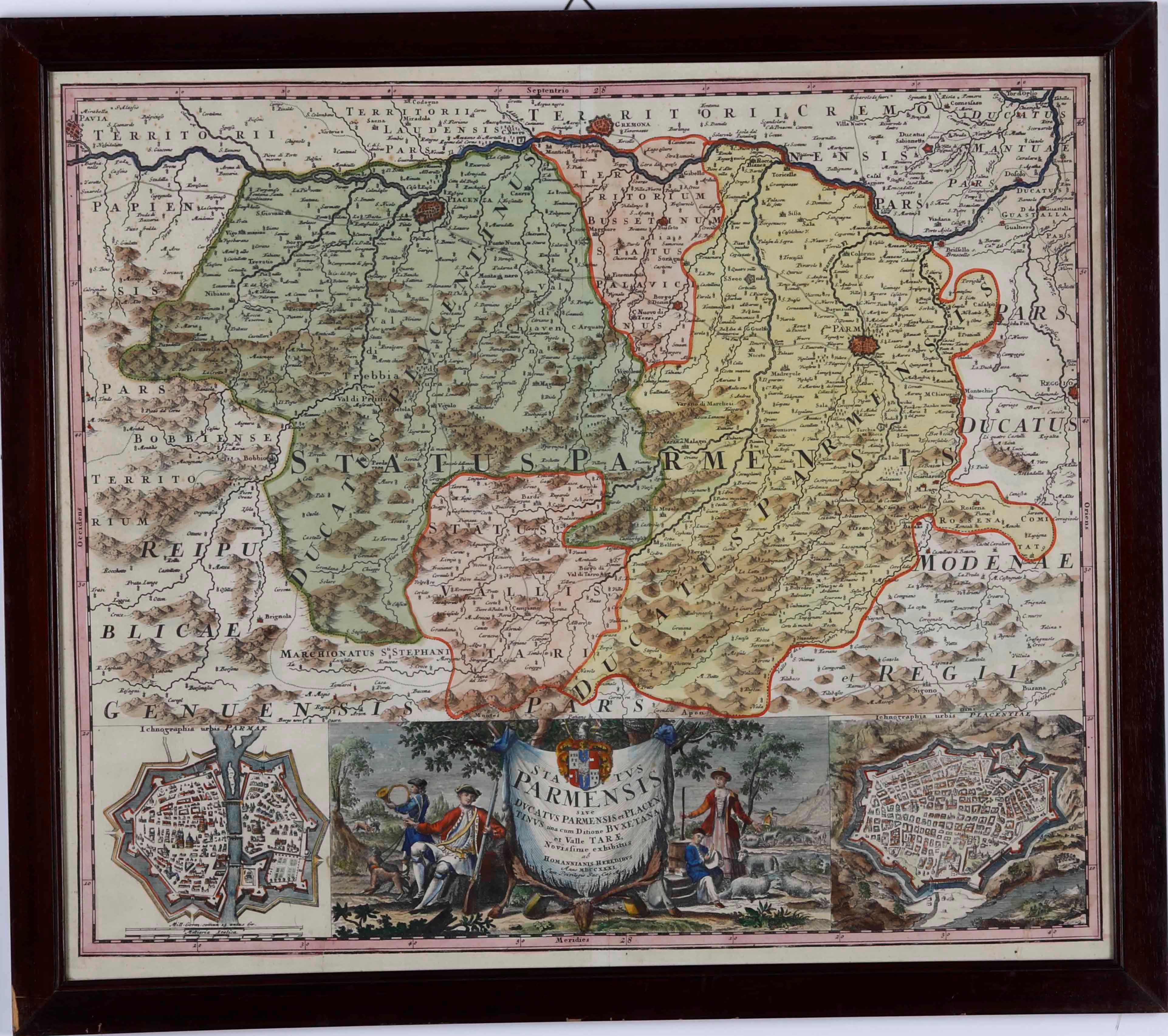 Bella mappa della regione in coloritura presumibilmente coeva. In basso sono inserite le piante di Parma e Piacenza e un bellissimo cartiglio bucolico. Ottimo stato di conservazione. Entro cornice in legno