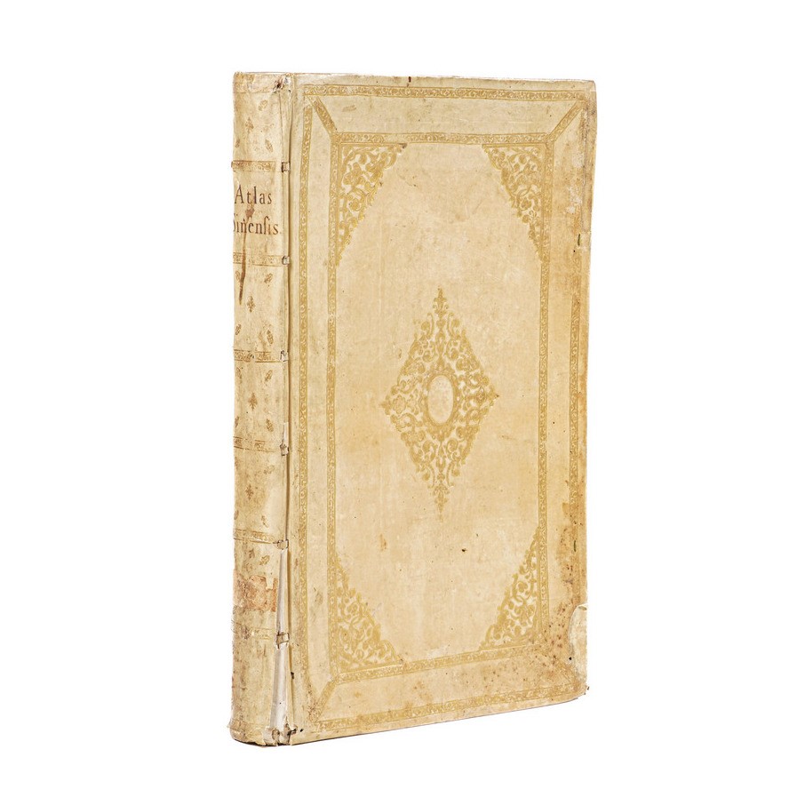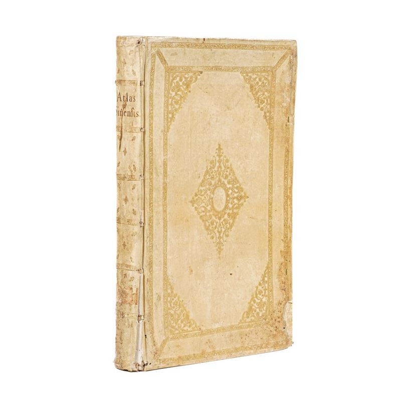 In-folio. Bellissima rilegatura coeva in piena pergamena, con ricchi fregi ai piatti e al dorso. Titolo manoscritto al verso. Questo tipo di rilegatura è tipica dell'Atelier Blaeu. Al contro piatto anteriore è applicato il talloncino di provenienza del celebre librario antiquario fiorentino Leone Olschki. Frontespizio allegorico inciso e finemente colorato + 17 mappe a doppia pagina con bella coloritura. Prima edizione del primo atlante europeo dedicato alla Cina. Questa edizione fu pubblicata separatamente, ma divenne comunque il sesto volume del Theatrum di Blaeu. Le mappe sono ricavate da rilievi di Martino Martini. Questo atlante risulta composto da 17 carte, contiene 1 carta generale della Cina, 15 delle provincie, e una carta separata del Giappone. Purtroppo l'esemplare, anche se del tutto genuino risulta fortemente ossidato. Inoltre sono presenti alcune fioriture e piccoli strappi marginali