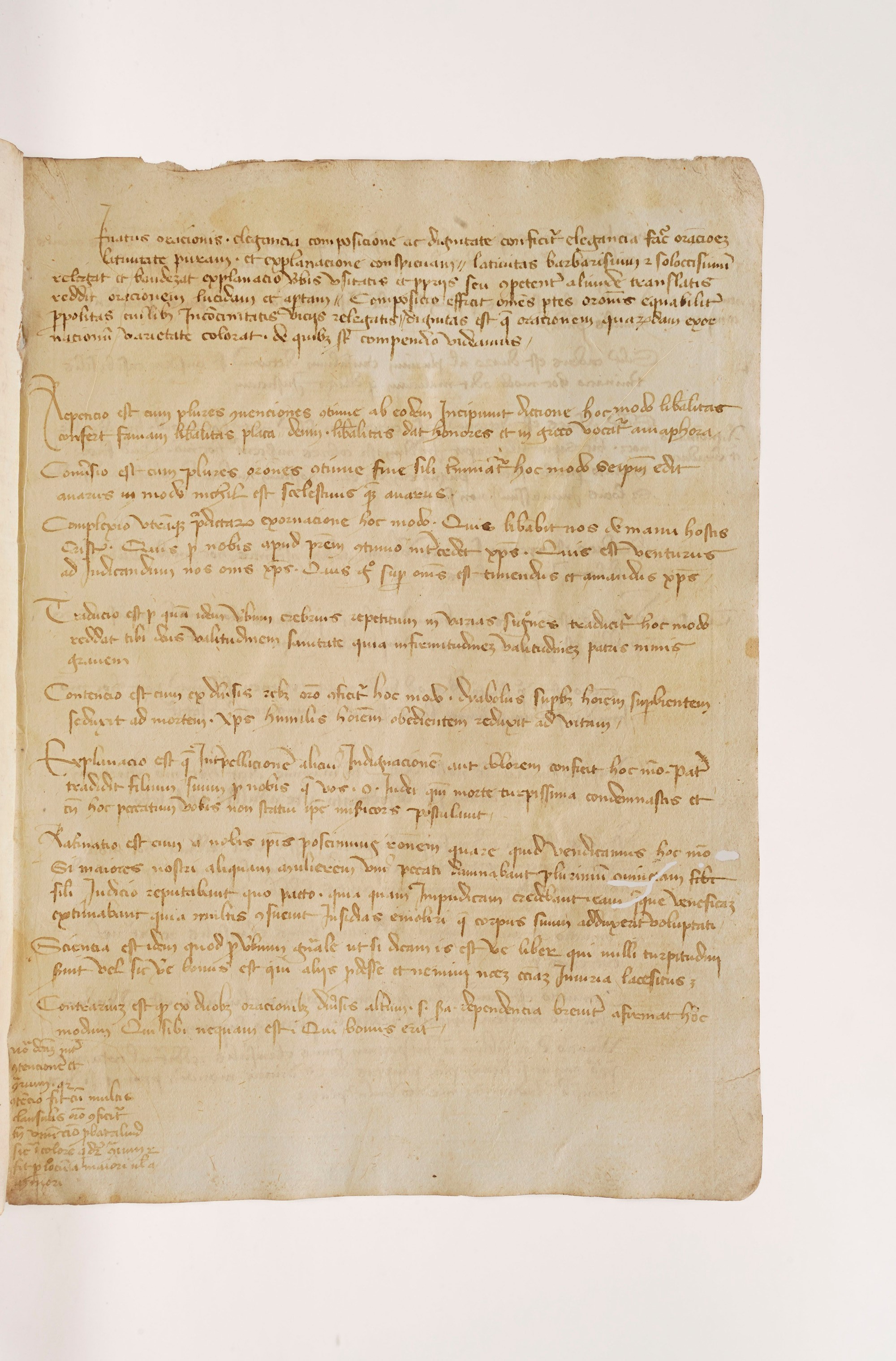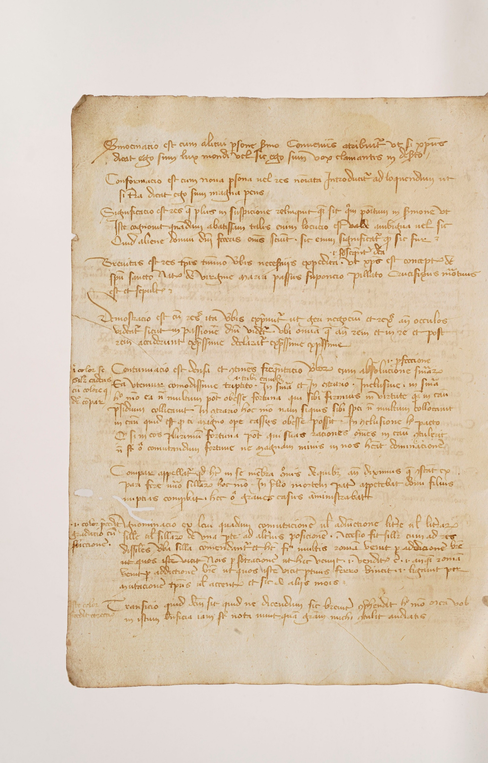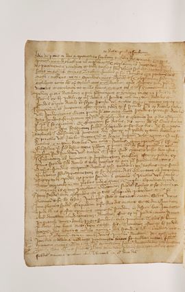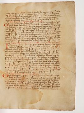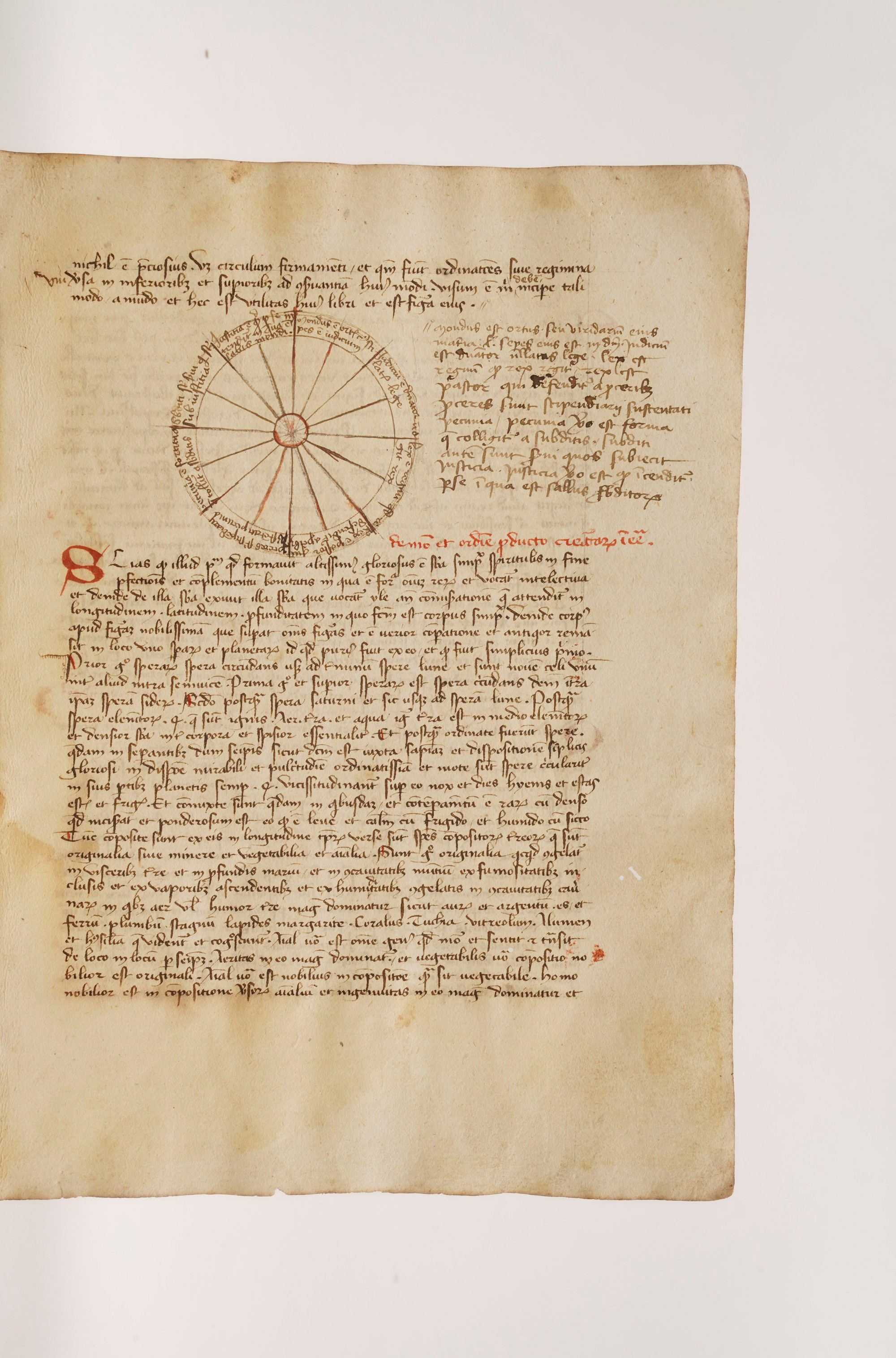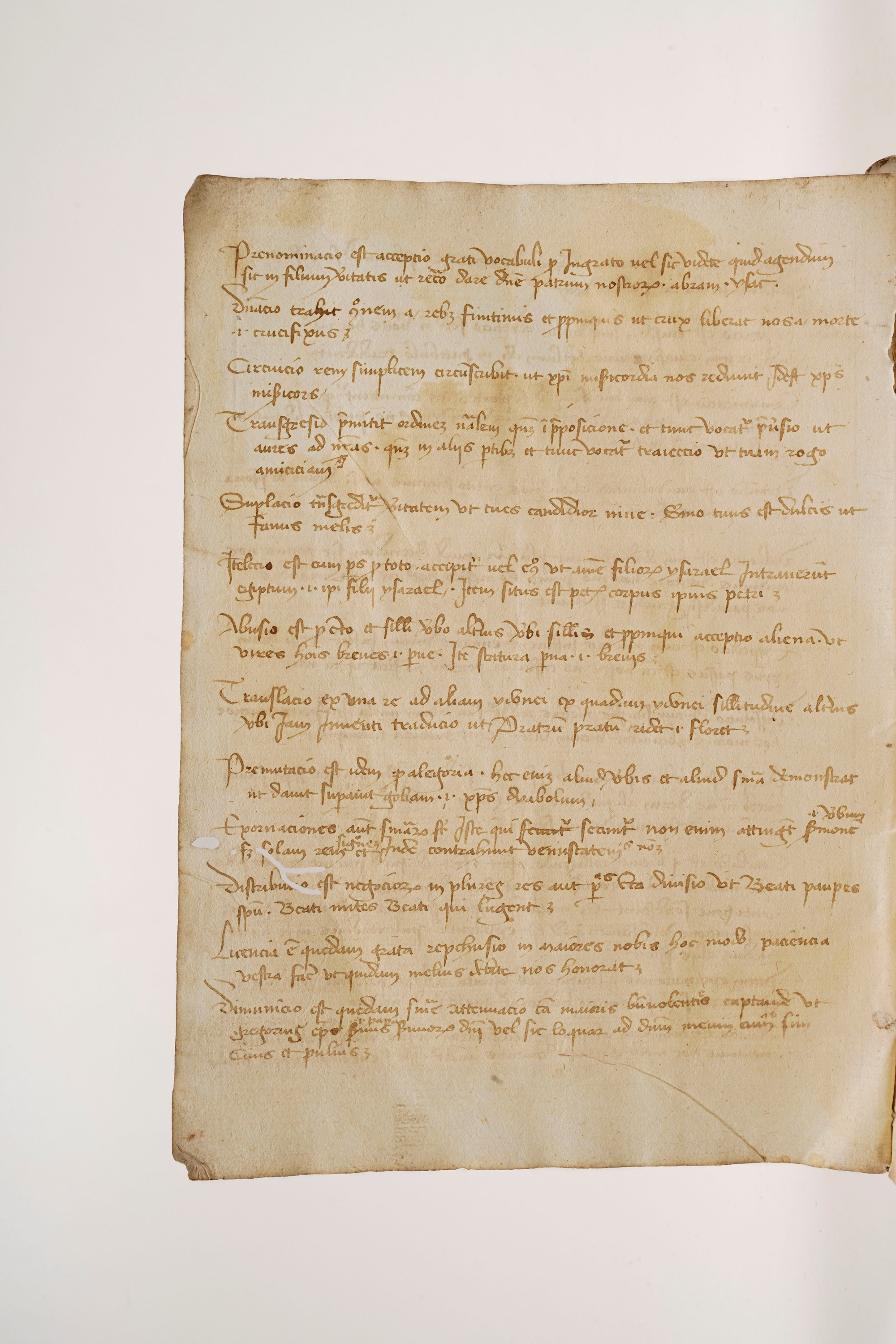 Manoscritto composto da 46 fogli non numerati. Rilegatura coeva in piena pergamena morbida, staccata e con danni da roditore. La carta utilizzata presenta una filigrana rappresentante una scimmia (Reggio Emilia, prima metà del secolo XIV). Libro Miscellaneo che tratta diverse materie. Ad una prima analisi sembrerebbe essere stato compilato da almeno due mani diverse. Interessante e meritevole di approfondimento e di studio.