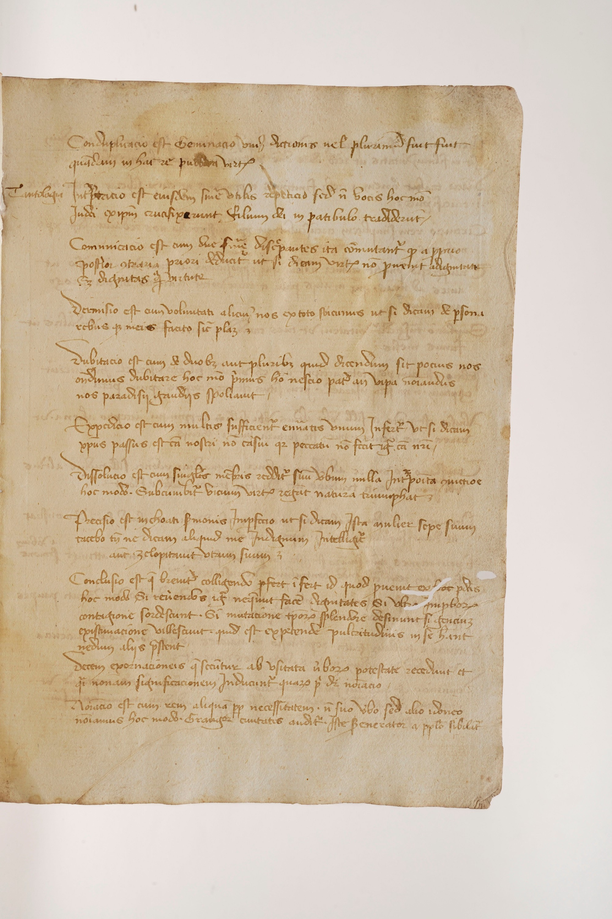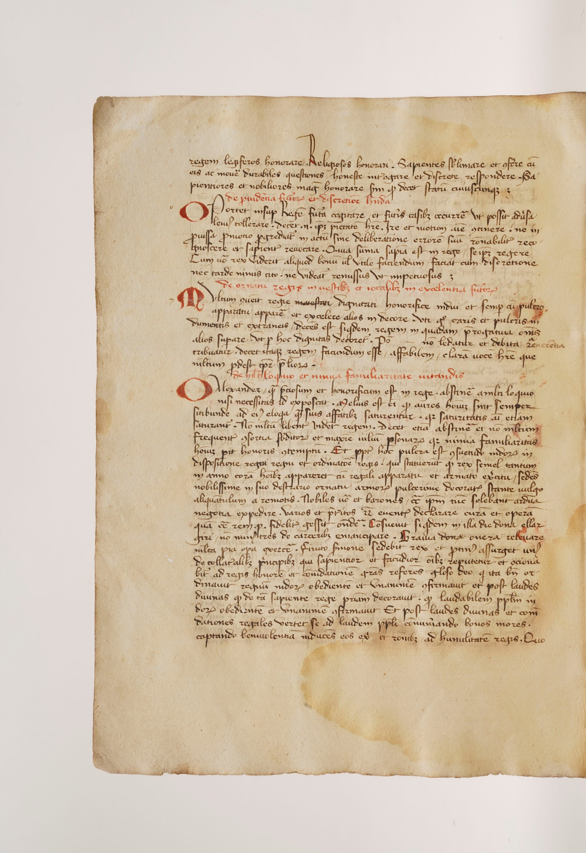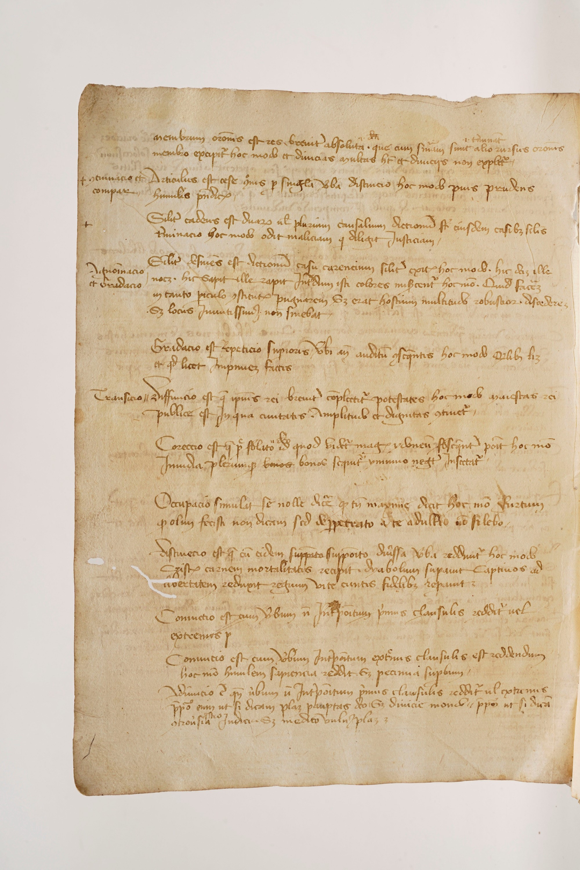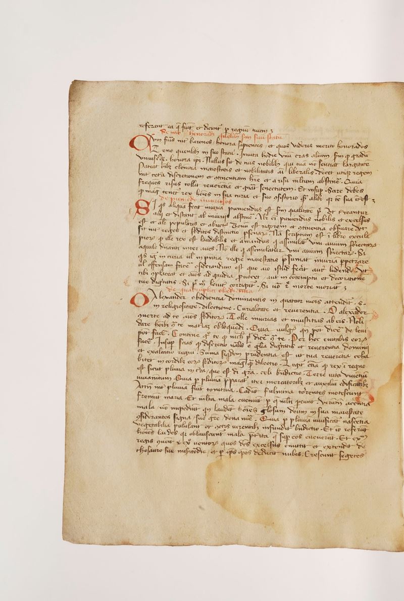Manoscritto composto da 46 fogli non numerati. Rilegatura coeva in piena pergamena morbida, staccata e con danni da roditore. La carta utilizzata presenta una filigrana rappresentante una scimmia (Reggio Emilia, prima metà del secolo XIV). Libro Miscellaneo che tratta diverse materie. Ad una prima analisi sembrerebbe essere stato compilato da almeno due mani diverse. Interessante e meritevole di approfondimento e di studio.