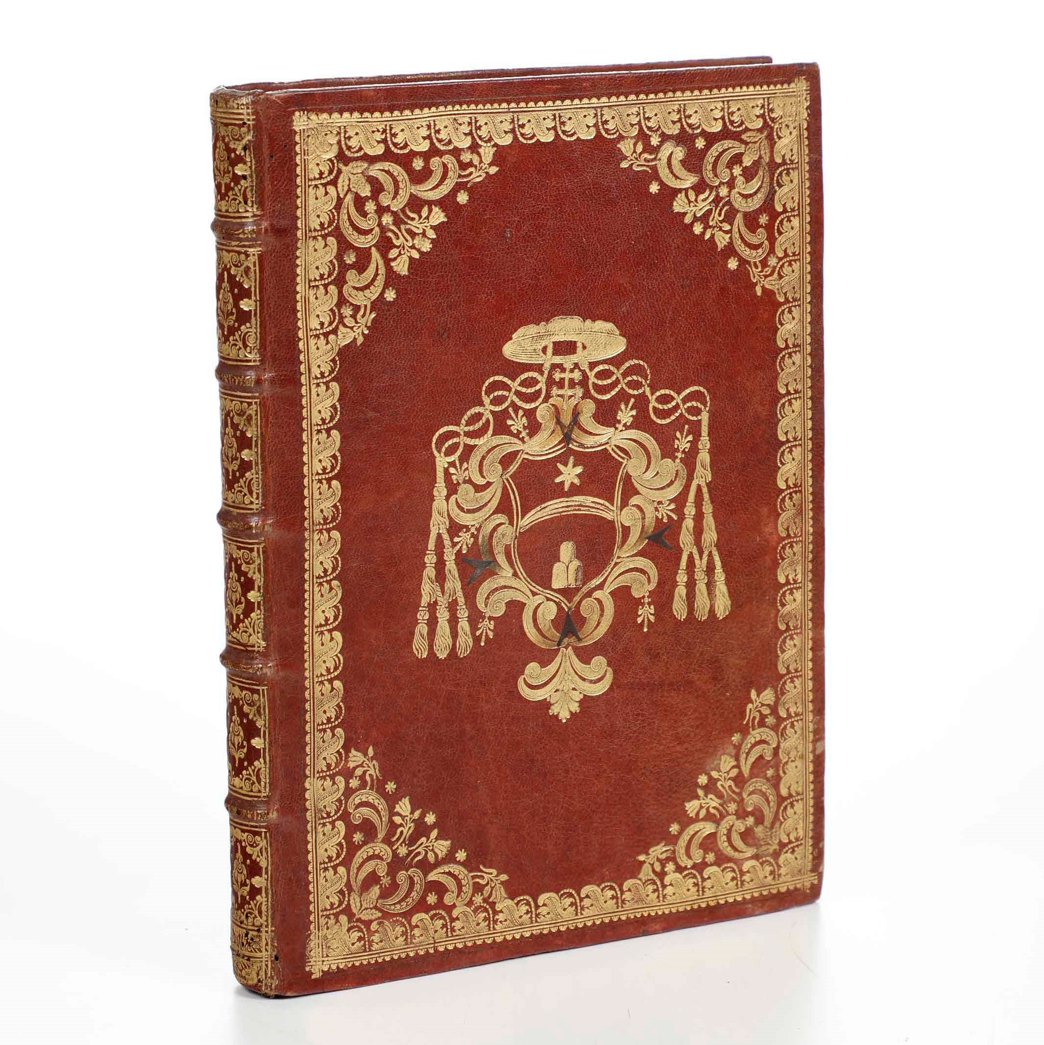 In quarto. Bella rilegatura coeva in marocchino rosso. Armi cardinalizie e croce di Malta ai due piatti. Bel manoscritto cartaceo, in condizioni eccellenti qui, in esemplare di presentazione.