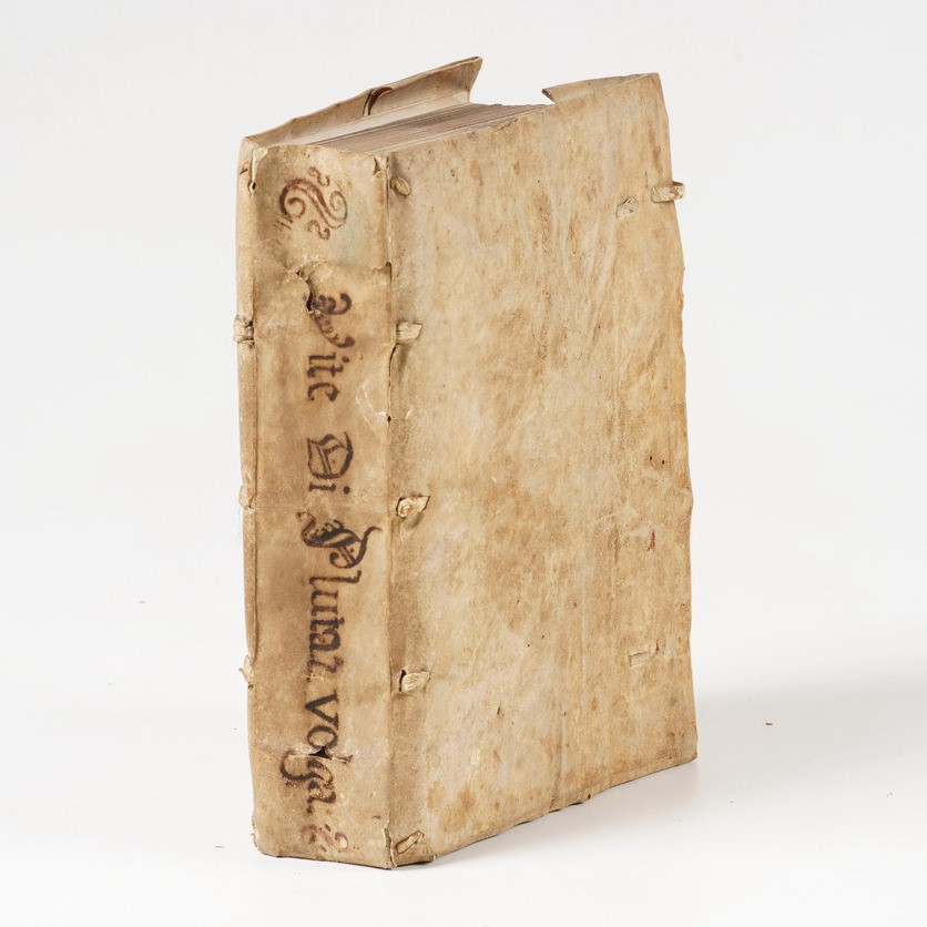 In quarto. Rilegatura coeva in piena pergamena floscia con titolo calligrafico al dorso. Piccole gallerie di tarlo su alcune carte. Gore insignificanti e sporadiche arrossature. Buon esemplare. Ex libris manoscritto all’ultima carta bianca. Dopo la fine della seconda parte è inserito un fascicolo che contiene la vita di Marco Bruto, non sempre presente in altri esemplari. Bella edizione illustrata con 23 vignette silografiche nella prima parte e 28 nella seconda, attribuite a Giovanni Andrea Valvassore.