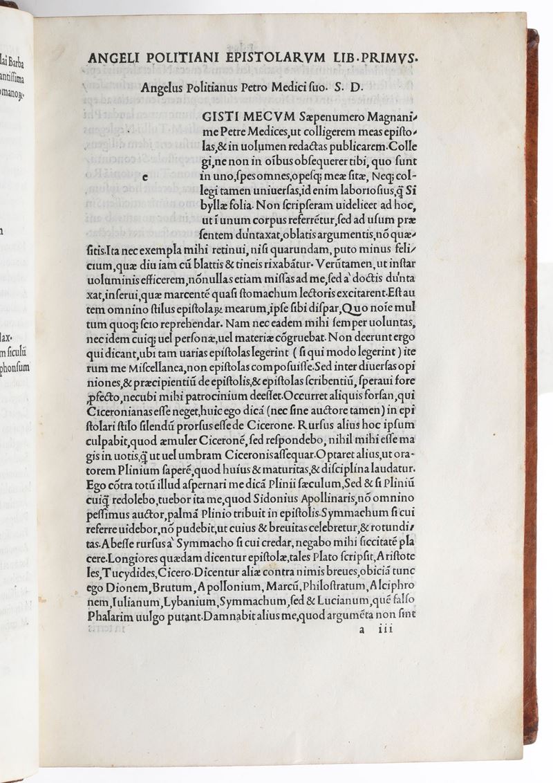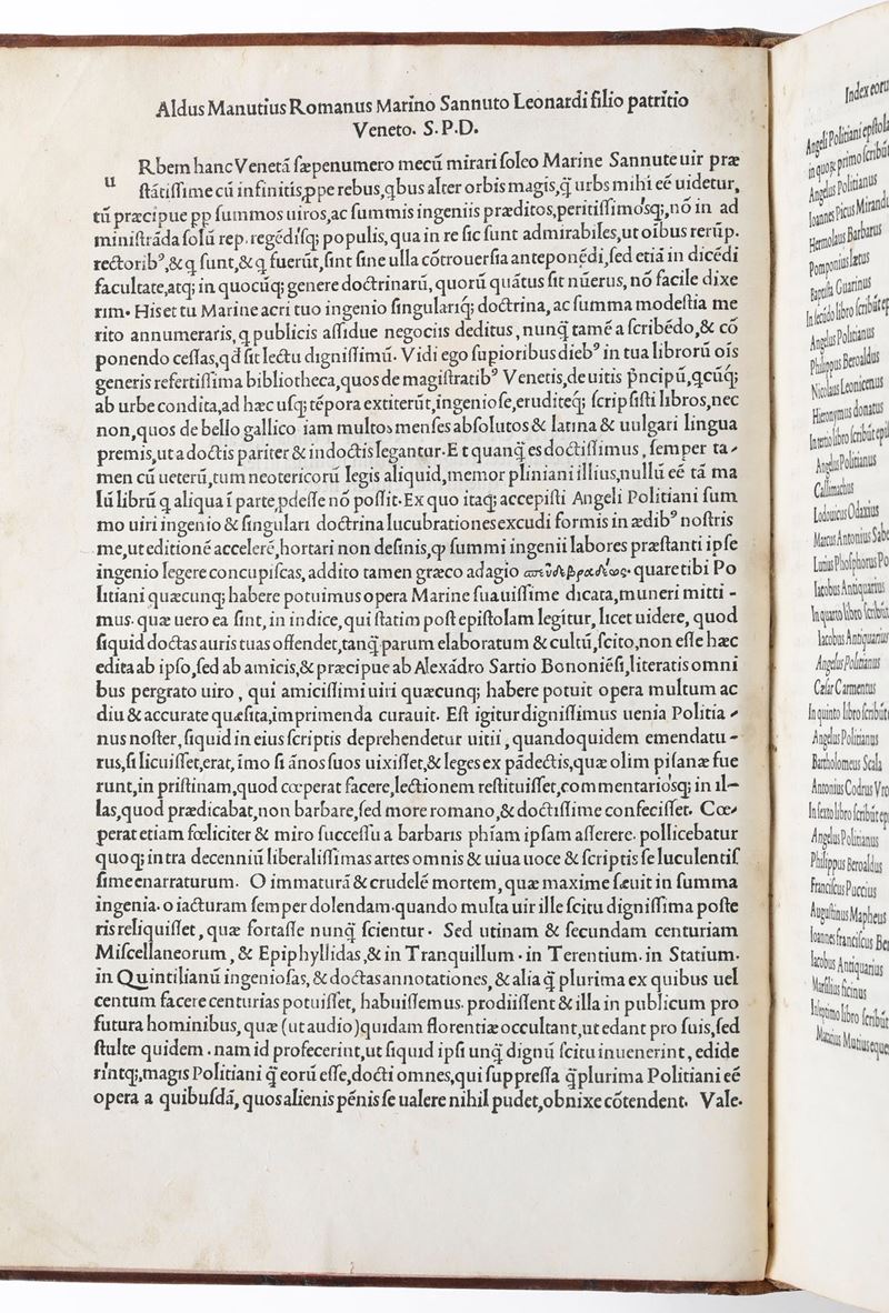Esemplare assai bello, fresco e marginoso di questa "editio princeps", della raccolta dell'opera latina del Poliziano stampata a Venezia da Aldo sul finire del secolo XV. Collazionato completo.