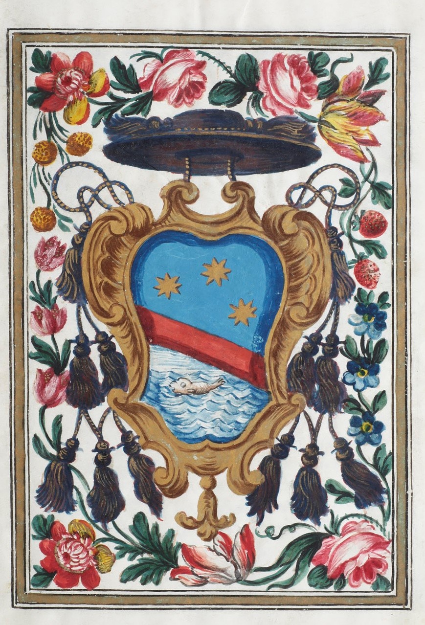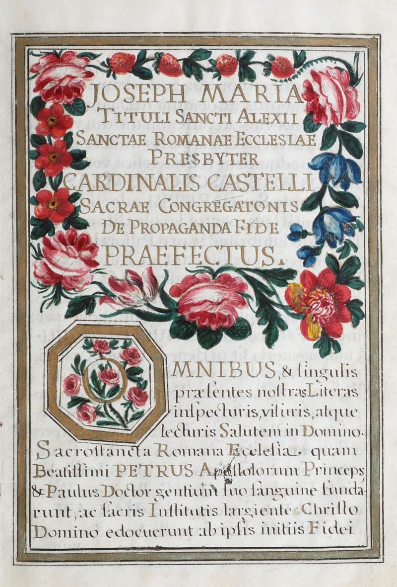 In-4°. Sette fogli pergamenacei. Due miniature a piena pagina raffiguranti stemmi cardinalizi e quattro carte di testo, vergato in inchiostro nero e oro. Privo di legatura.
