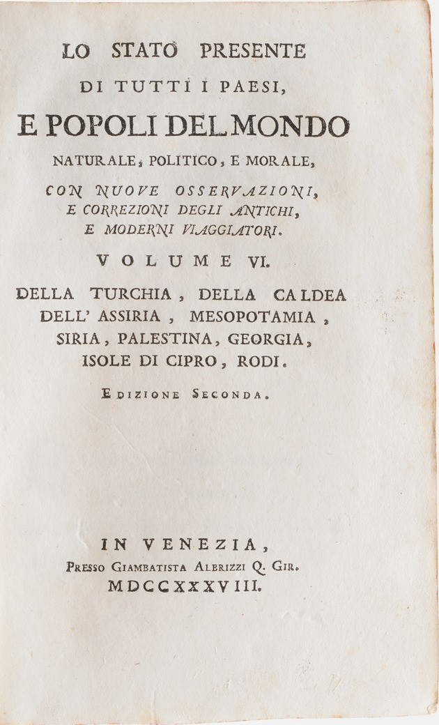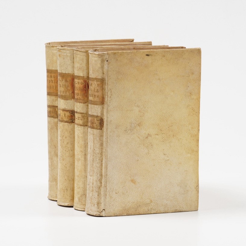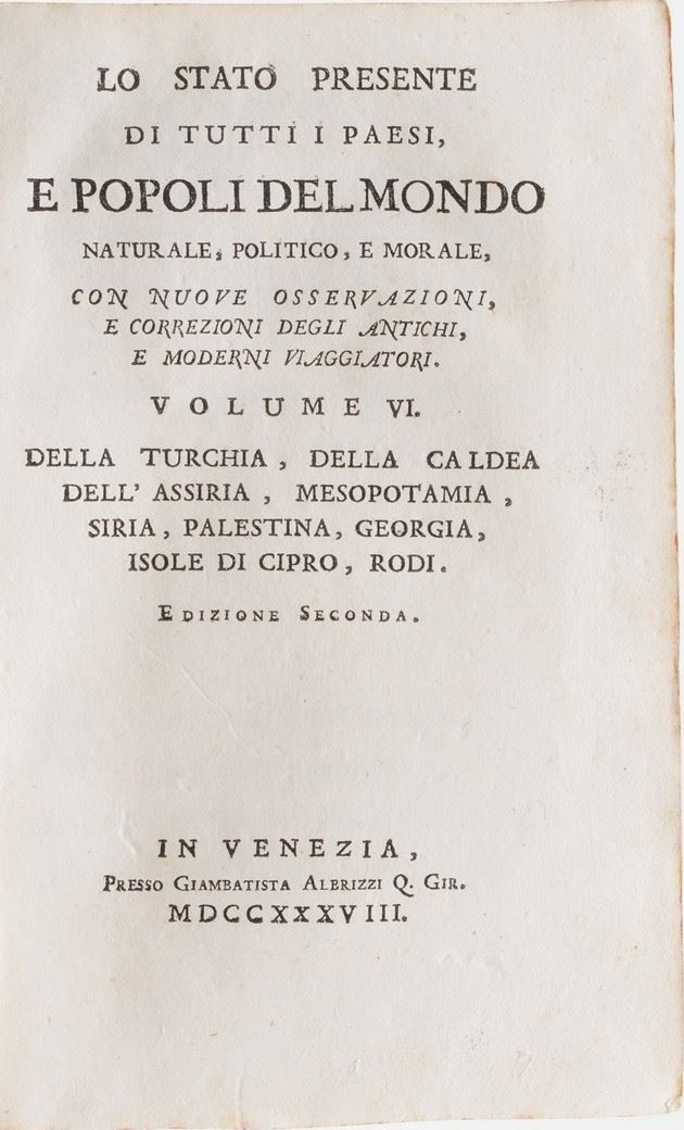 In-8°. Rilegature coeve in piena pergamena rigida. Sono presenti soltanto i seguenti volumi: volume VI; volume IX; volume X; volume XI; volume XII; volume; XIII; volume XIV; volume XV; volume; XVI; volume XVII; volume XIX; volume XX parte prima; XX parte seconda; volume XXI; volume XXII. Poche sono le tavole incise presenti, perlopiù si tratta di carte geografiche, alcune delle quali risultano ripiegate. Proposto come opera scompleta e collezione di stampe