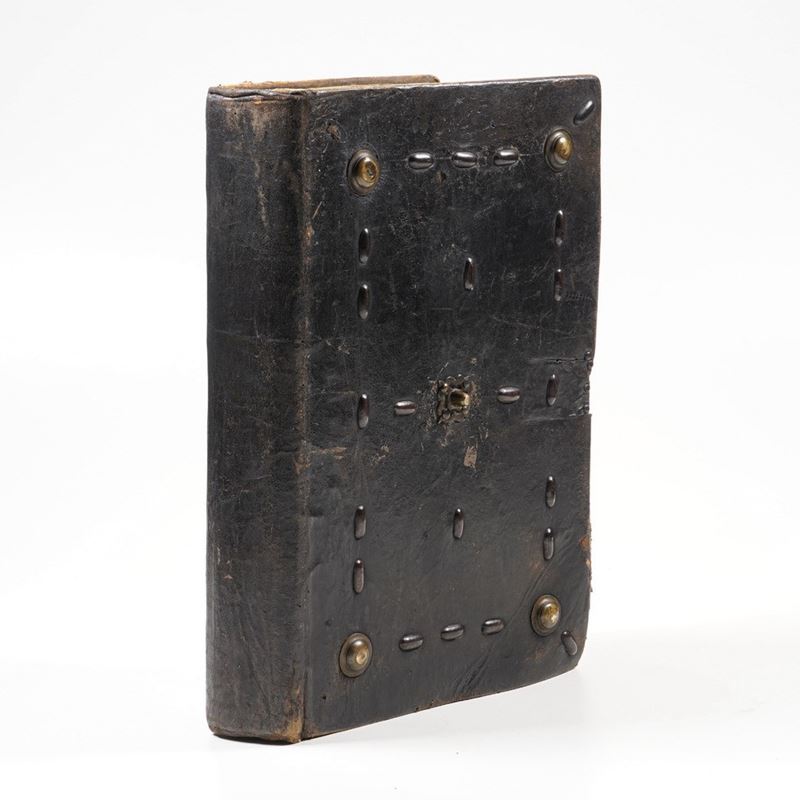 Grande volume in-folio. Rilegatura coeva in stile monastico con borchie metalliche ai due piatti. Frontespizio e testo stampato in rosso e in nero