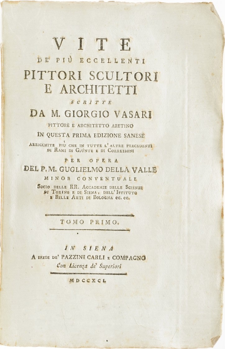 Vasari Giorgio Vite dei più eccellenti pittori scultori architetti...in questa prima edizione sanese...arricchite per opera del P.M. Guglielmo Della Valle. In Siena, Pazzini Carli e compagno, 1791-1793. Nove volumi in undici tomi.