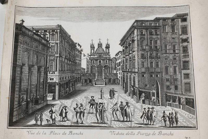 -Genova, veduta della Piazza de Banchi, 43x32 cm. Venezia, Remondini, 1700.