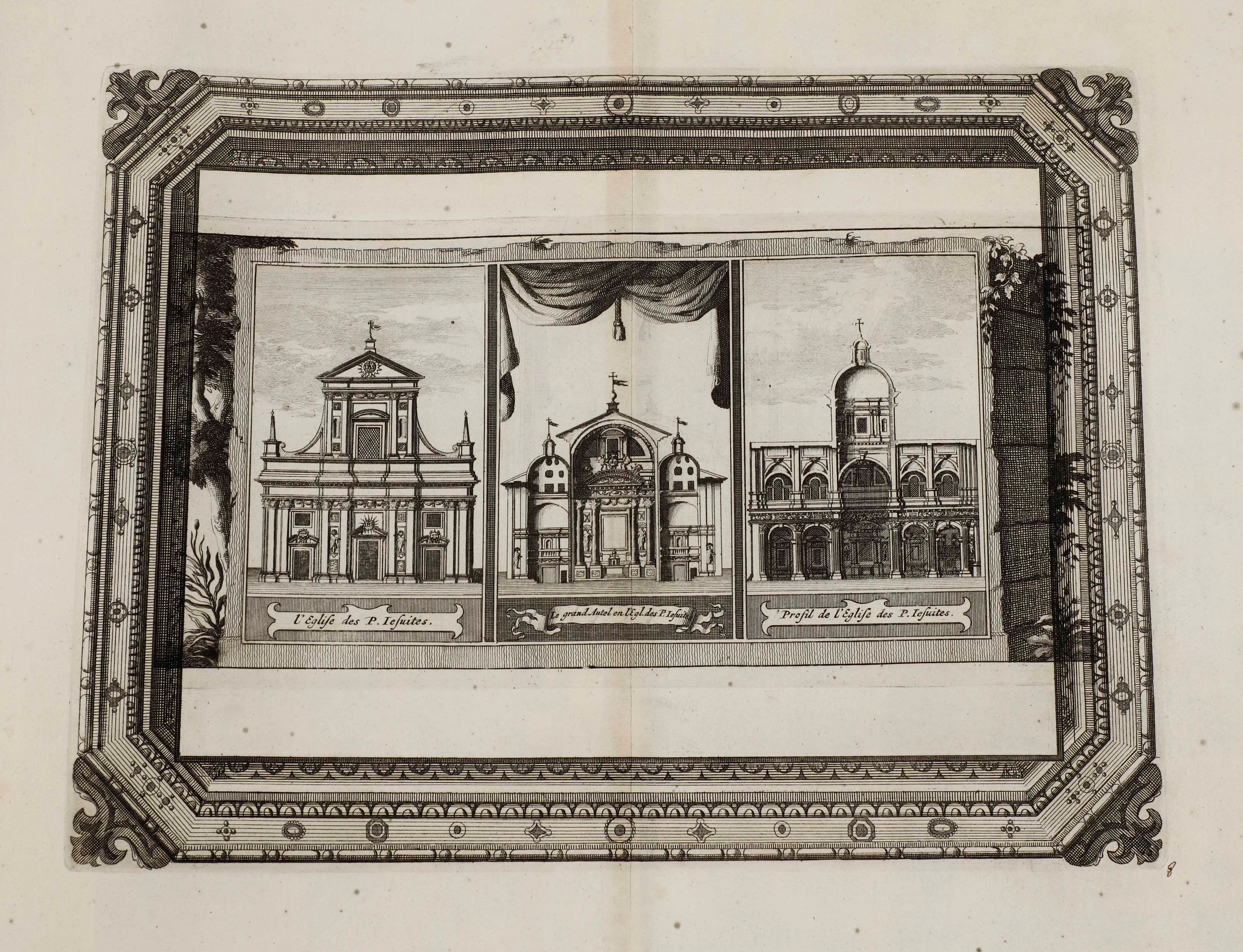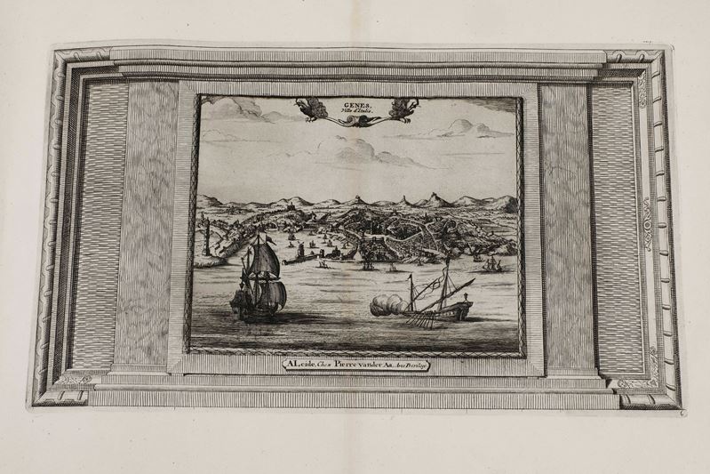 -Genova, suite completa di tre fogli con vedute: Genes Ville d’Italie/Tre vedute su un unico foglio/Sei vedute su unico foglio, 41x24 cm. Leida, Pierre Vander, 1720.